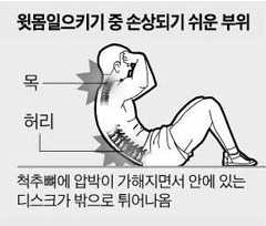 윗몸을 일으키는 과정에서 척추의 곡선이 깨지면서 척추뼈 사이에 있는 디스크가 뒤편에 있는 신경을 눌러 통증이 발생하는 것이다. 몸 근육이 세게 수축하면서 디스크 속 압력이 높아져 디스크가 터질 수 있다. 실제 미국 캘리포니아 포트 브래그에 주둔하는 미군을 대상으로 연구한 결과, 체력검정 테스트 동안 발생한 부상의 56%가 윗몸일으키기 때문인 것으로 나타났다.