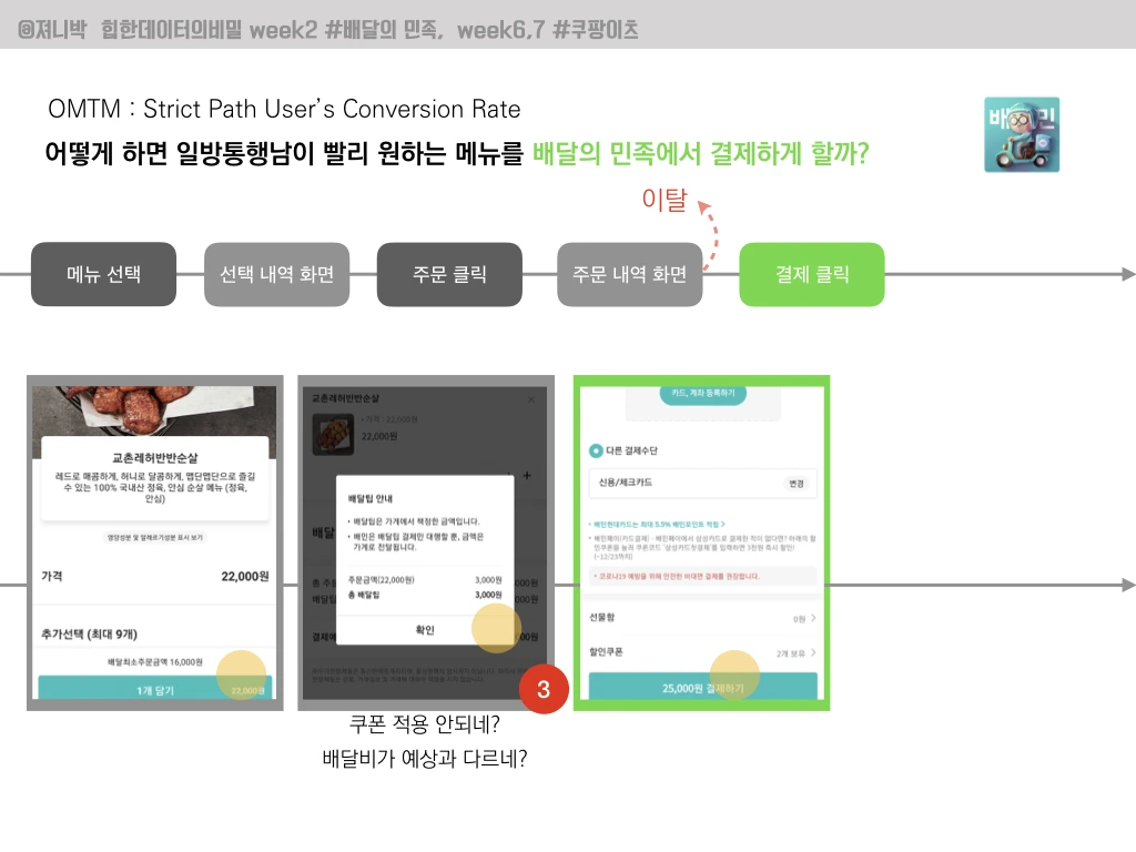 그러면, OMTM(One Metric That Matters) 제일 중요한 단일 지표는 쿠팡이츠든, 배달의 민족이든 '앱을 켜고 홈 화면으로 진입한 고객 수' 중 '최종 결제해서 배달시켜 먹은 고객 수', 즉 결제 전환율일 것이다.