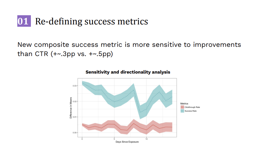그리고 스포티파이의 사용자 데이터와 목적을 반영하는 새로운 검색 성공 지표는 일정 시간을 넘는 스트리밍 시간, 플레이리스트에 추가하는 이벤트, 특정 아티스트 팔로우하는 이벤트 등에 가중치가 매겨진 복합 지표(Composite Success Metric)입니다. 실제로 스포티파이 UX 개선 시에 일반적인 성공 지표 CTR보다 더 민감하게 사용자 반응을 그려내는 것이 검증되었습니다.
