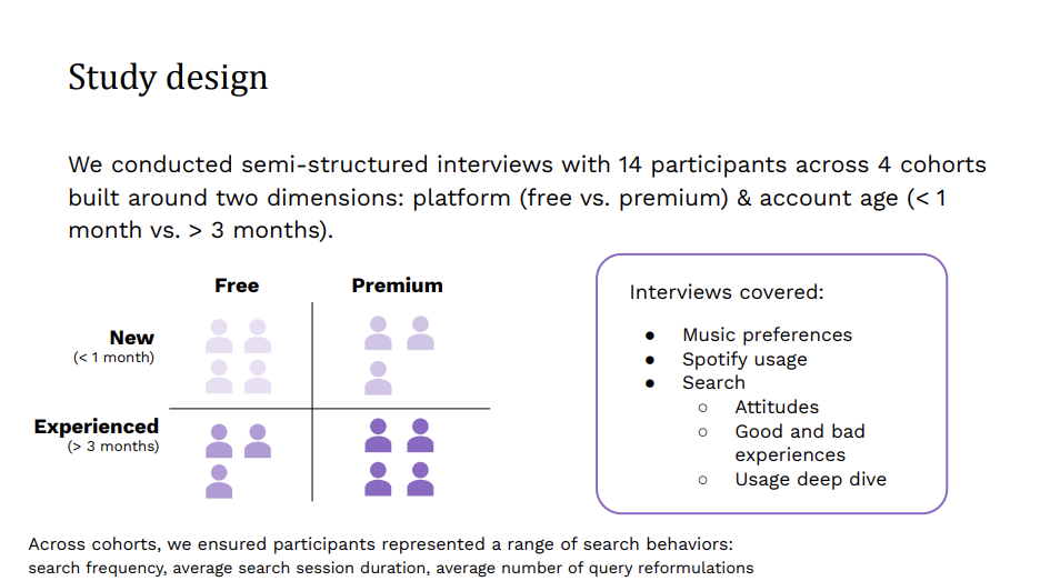 스포티파이는 이런 일반화된 검색의 성공 지표(Successmetrics)에 대해 되물어봅니다. '언제 어떤 사용자에게나 ‘가장 빠르게, 가장 최상단에 원하는 검색 결과를 콕 집어’ 보여주면 성공적인 검색 경험일까요? 위의 광고 건너뛰기 사례처럼, 이번에도 양적 연구로 알기 어려운 부분을 보완해 줄 질적 연구, 사용자 인터뷰를 도입합니다. 아래 이미지에서 보이듯, 요금제와 계정 연한에 따른 4개 코호트, 총 14명 사용자 대상으로 스포티파이에서 언제 검색을 하게 되는지, 그때 목표(Goal)는 무엇인지를 분석했습니다. 그 결과 크게 두 가지로 정리할 수 있습니다.