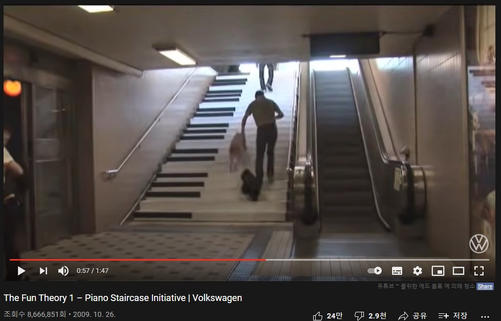 2009년, 스톡홀름의 한 지하철 역에서 촬영한 아래 영상을 보신 적 있으세요? 한 남자가 검정 하양 스티커가 붙어있는 계단 앞에서 고민하는가 싶더니, 두 마리 반려견들과 우당탕 계단을 올라갑니다. 오늘날에는 흔히 볼 수 있지만, 최초의 경쾌한 멜로디가 울려 퍼지는 '피아노 계단'은 바로 폭스바겐의 캠페인이었습니다.
