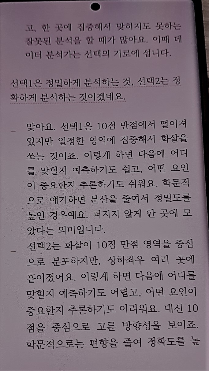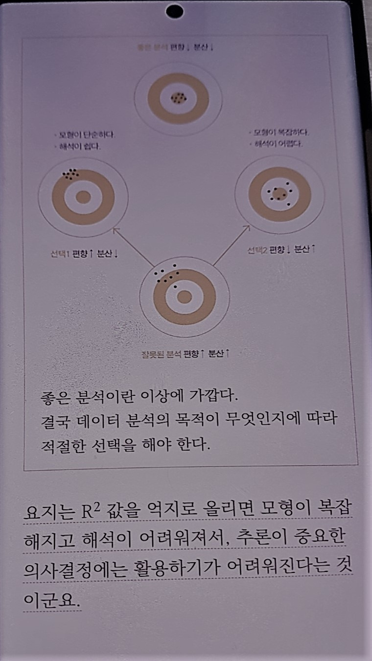 적절한 분석은 결국 선택의 문제이다. 양궁에 비유해서 이러한 딜레마, 편향-분산 트레이드오프(Bias-variance tradeoff)를 쉽게 설명한다. 선택 1, 특정 범위의 데이터에 초점을 두고 정밀하게 파고들면, 전체적인 관계성을 설명하지는 못한다(underfitting). 선택 2, 최대한 여러 경우의 수를 정확하게 설명하려면, 비정상적인 값까지 포함하다 보니 그래서 어떤 요인이 정말 중요한 것인지 추론해내기 어렵다(overfitting).