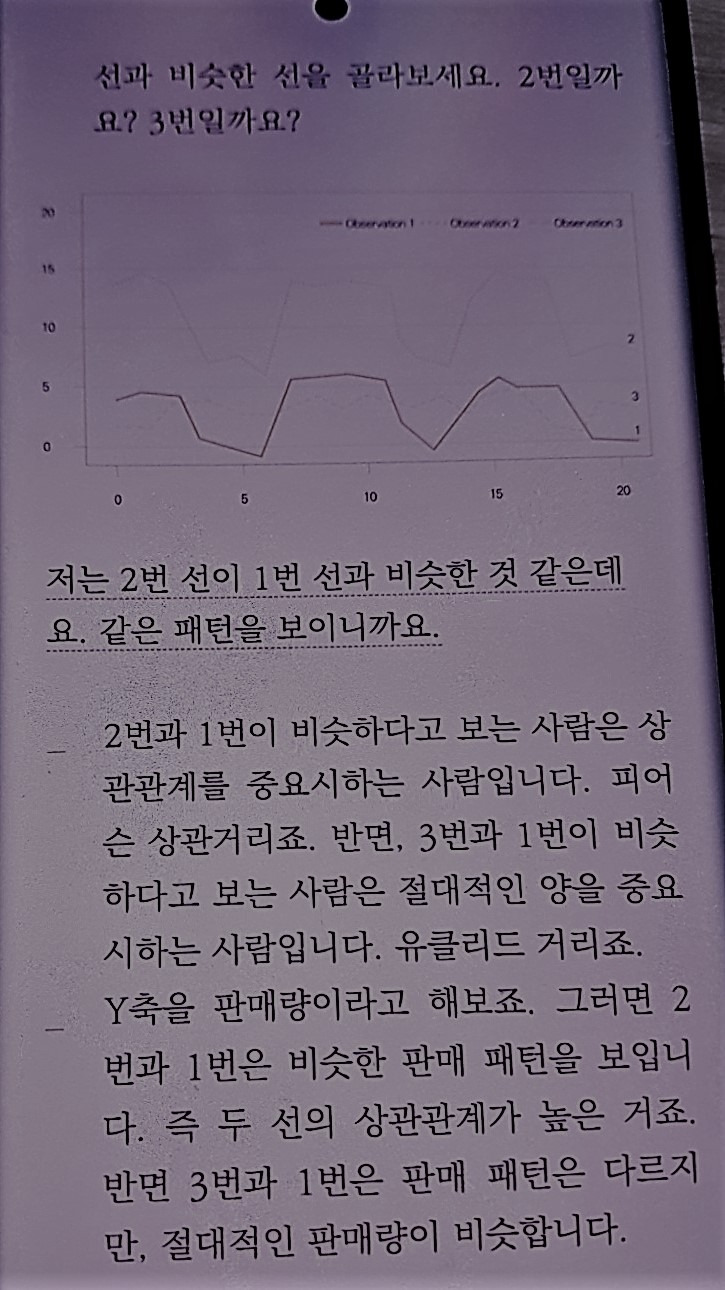 또한, 절대적 총량이 비슷한 경우(유클리드 거리, Euclidean Distance)와 기울기로 나타나는 선형 관계가 비슷한 경우(피어슨 상관거리, Pearson coefficient) 중 판단 기준 하나 택하는 것도 의사결정자에 달려있다.
