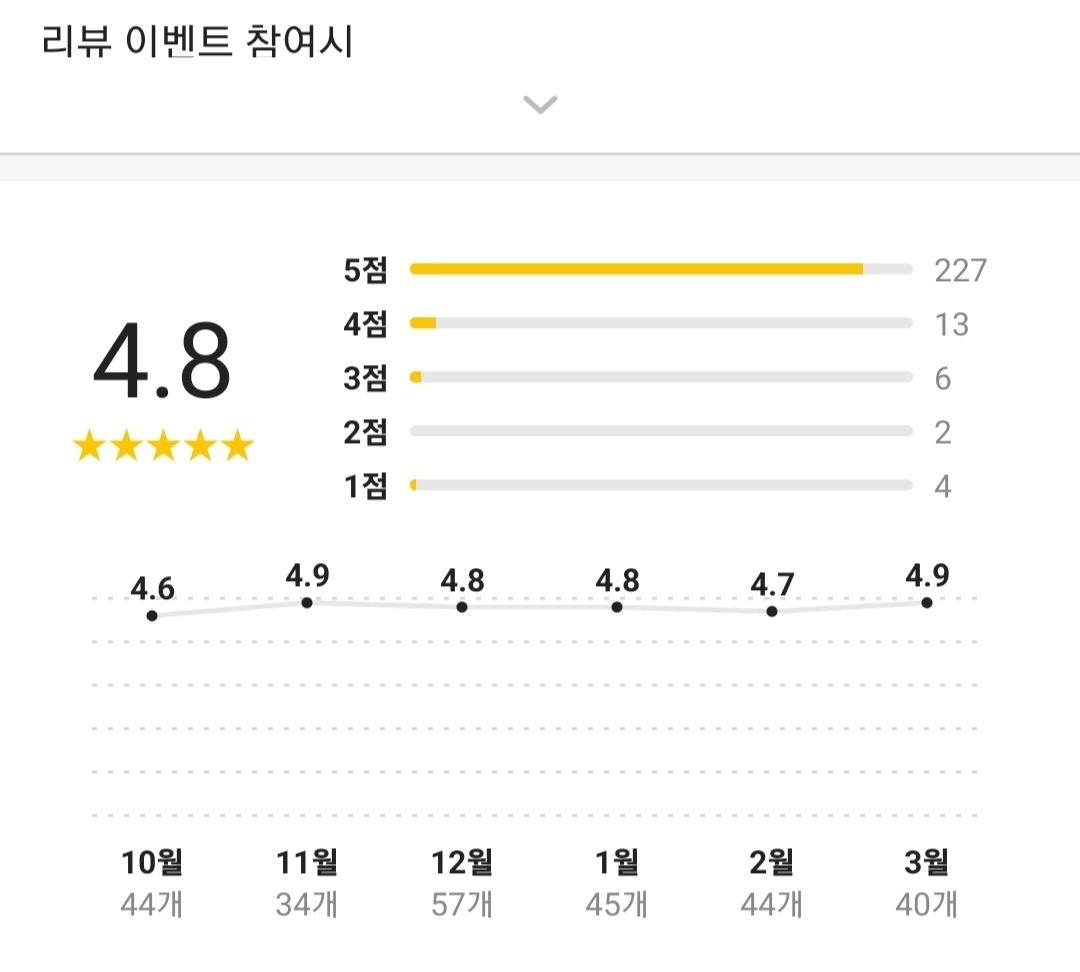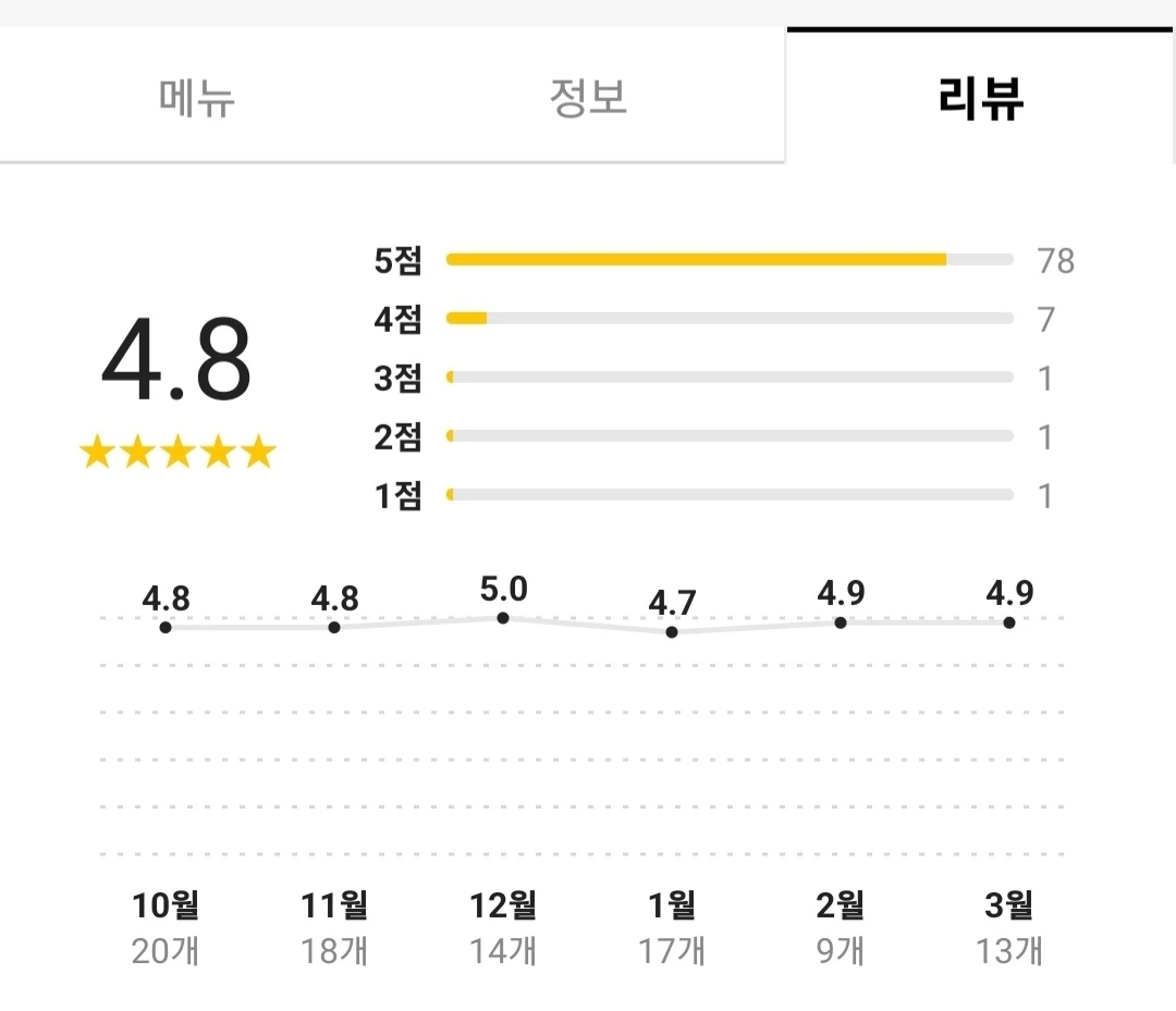 실제로 4.8점이 최근 6개월 간의 평점인 두 돈가스 집은 많이 다릅니다.총 리뷰 수가 왼쪽은 252개, 오른쪽은 88개로 3배 가까이 차이가 납니다. 총 개수가 다르니 5점 리뷰가 차지하는 비율도 막대그래프에서 눈여겨봅니다. 무엇보다, 6개월 간의 평점 변화 추이도 다릅니다.