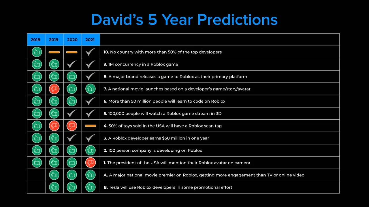 다음은 로블록스의 CEO이자, BuilderMan으로 활약 중인 데이비드 바추키(David Baszucki)가 5년 전 이야기한 로블록스의 미래 중에 80% 넘게 달성했다며 보여준 화면입니다. 이미 2019년에, 평균 크리에이터(Roblox Developer)가 5천만 달러 연수입을 올리고, 100개의 이상의 기업이 생겼으며, 오프라인에 그 세계관이 확장되고 있습니다.