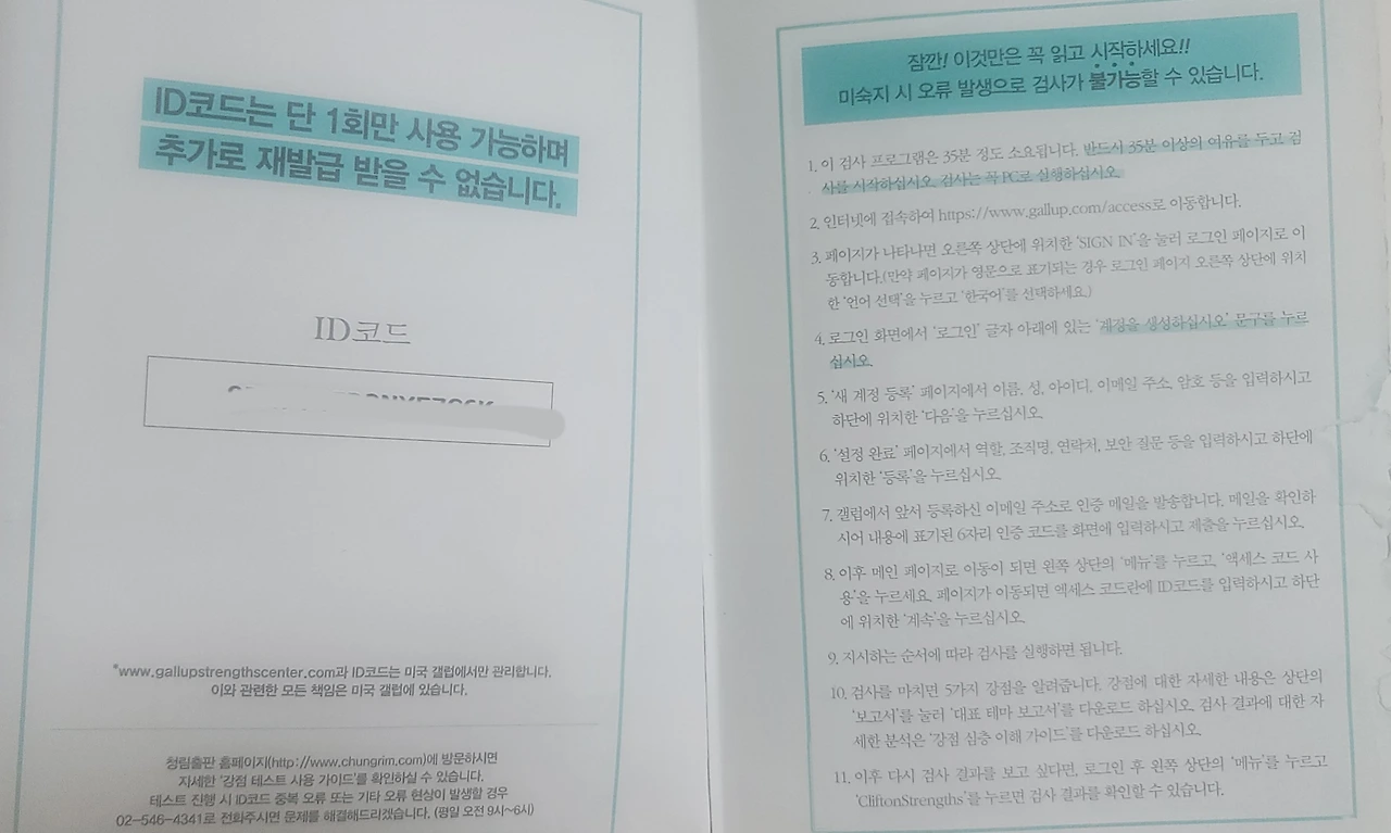 강점혁명 책 속지. 1회용 ID코드뫄 갤럽 강점진단 하는 법