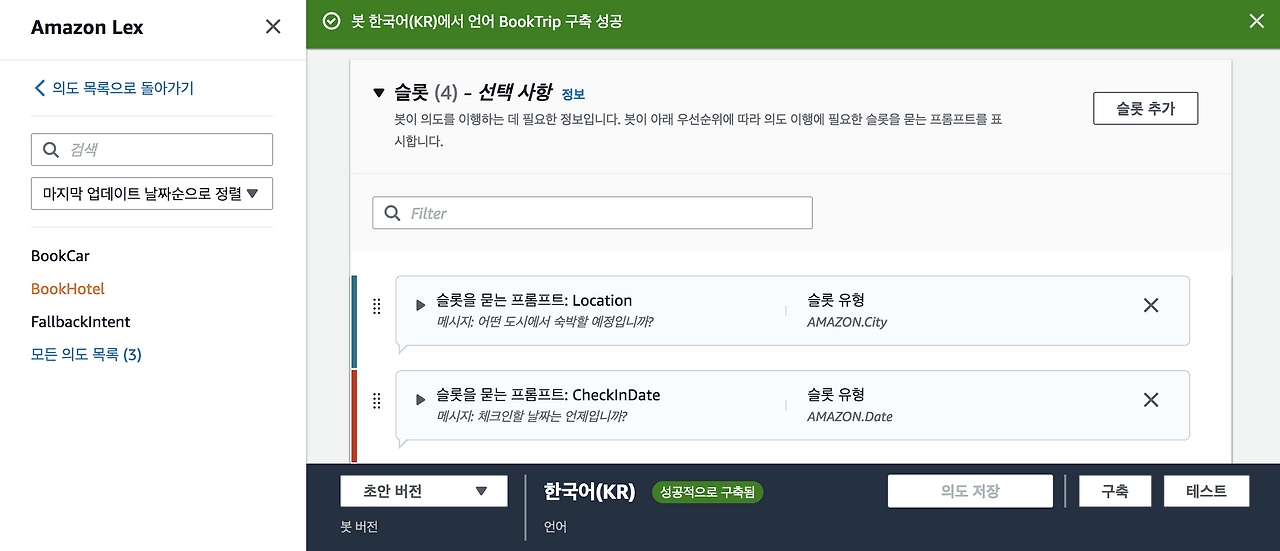 요청에 언급되지 않은 외부의 정보를 검색(AWS Lambda)하는 것이 가능하고, 여태 오간 대화 내용 - "호텔 예약" + "장소는 뉴욕" + "날짜는 9월 30일" 등 맥락(context)을 유지하고 관리(AWS DynamoDB)할 수 있습니다. 2021년 9월, Amazon Lex 플랫폼이 드디어 한국어도 지원을 시작했는데요. 한국어로 말하고 쓰면 Alexa 대화형 챗봇(Conversational Bot)을 만들 수 있습니다.
