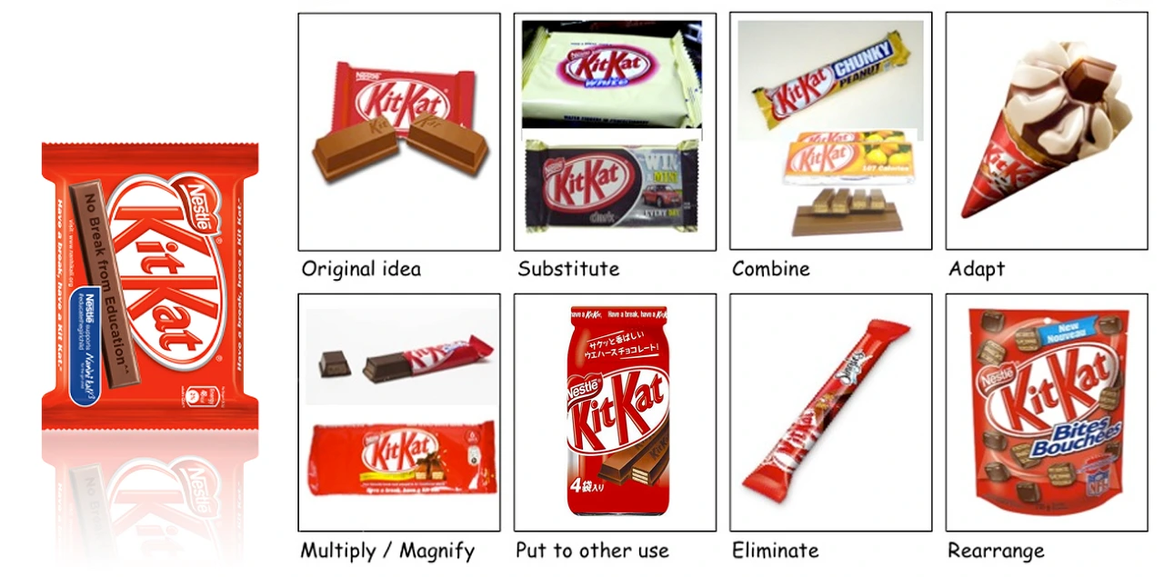 제한된 리소스를 가지고 다양한 아이디어를 도출하는 방법론 중에 스캠퍼 기법(SCAMPER)이 있습니다. 아래 킷캣 초콜릿의 사례를 통해, 초콜릿이라는 작은 단위의 요소를 일곱 가지 규칙으로 ㅡ 다른 원료와 바꾸거나 혼합하거나, 크기나 위치를 바꾸는 등 ㅡ 얼마나 다양한 상품을 만들어낼 수 있는지 쉽게 이해할 수 있습니다.