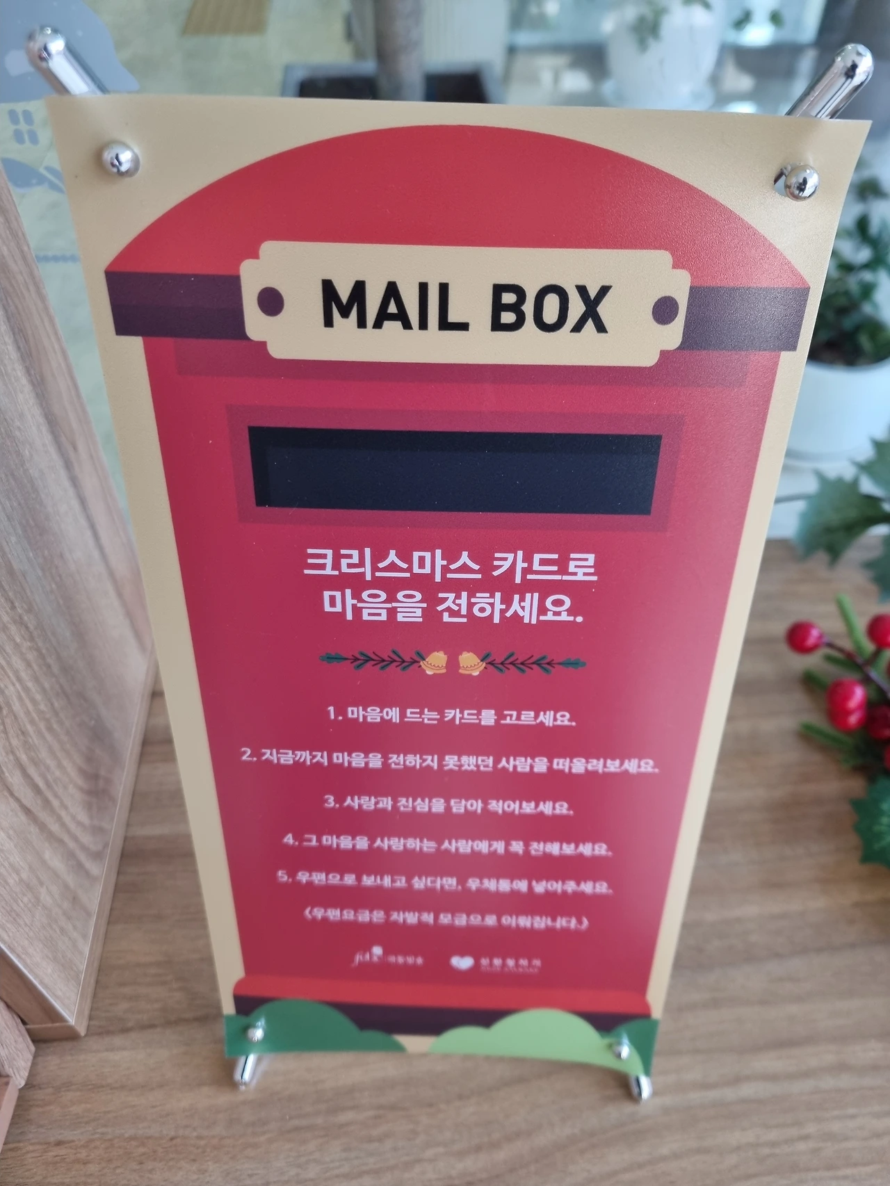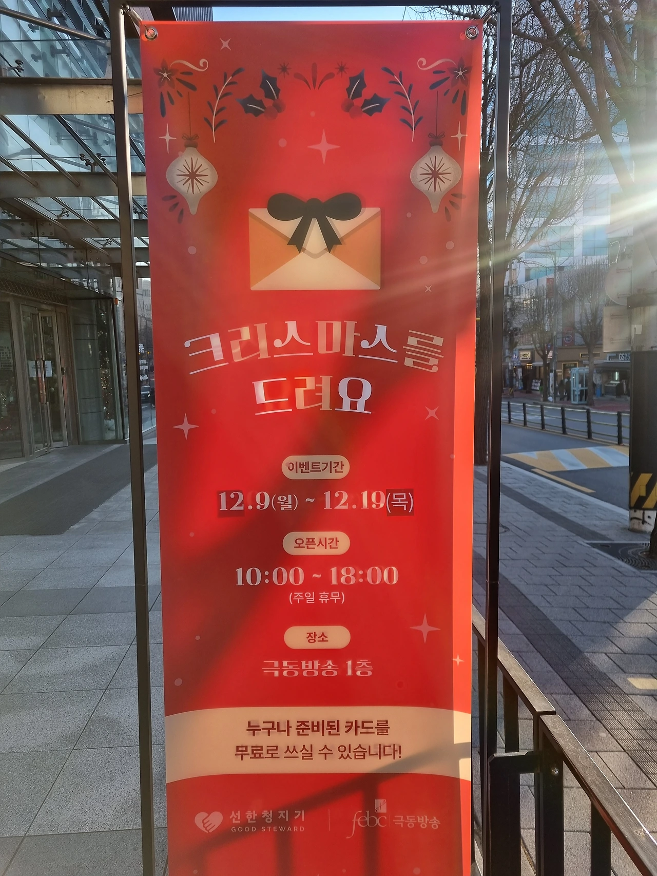 볼일을 마치고 버스 정류장에 섰는데 빨간색 입간판이 보인다. 정류장 바로 앞에 있던 극동방송 건물에서 크리스마스카드 나눔 이벤트를 하고 있었다. 이것도 이벤트 종료 하루 전날 우연히 근처를 지나다 발견하게 되었으니 어찌나 감사한지!