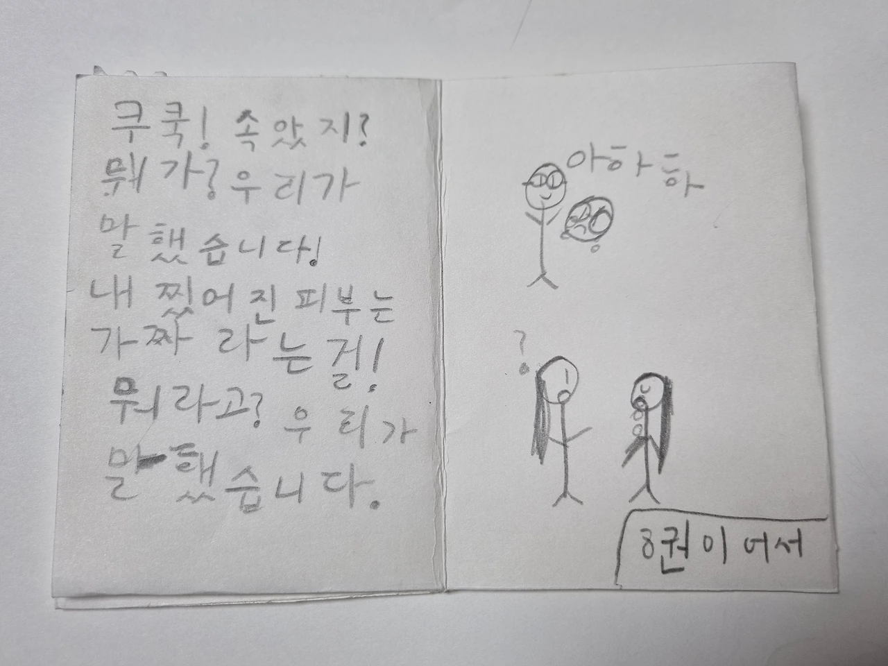 초등학생 딸아이는 요즘 시리즈물로 책을 발행 중이다. <은미의 하루>라는 제목의 책은 친구들 사이에서 인기가 좋다. 책이라고 해봤자 스케치북을 뜯어서 풀칠을 한 종이 묶음이지만, 그 위에 쓰인 글에는 나름 등장인물도 있고 서사도 있다. 대신 한쪽은 이야기책이었다가 한쪽은 그림책이었다가, 한쪽은 말풍선이 가득한 만화책으로 변화가 무쌍하다. 이야기를 끊는 타이밍도 기가 막히다. 1권, 2권, 3권... 마지막 페이지에 기재된 <이어서>, <다음 화에 계속>이라는 문구 때문에 탐독을 멈출 수가 없다. 친구들이 다음 화를 기다리고 있다며 김작가는 오늘도 창작 활동에 매진한다.