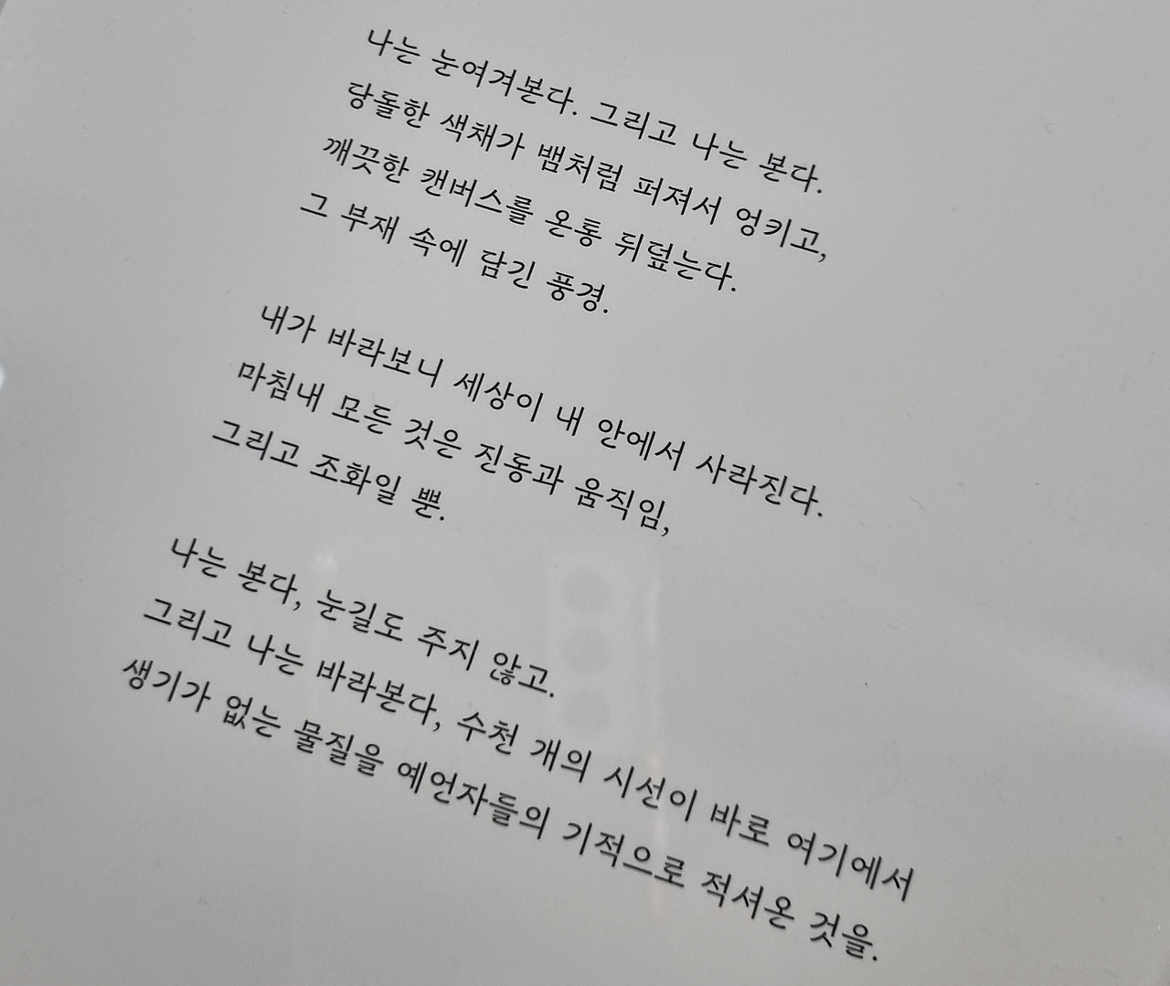 그림을 즐겨 감상하진 않았어도 정물화라던지 초상화 같은 것보단 실제적이지 않은 표현들을 선호했다. 해석해 낼 필요가 없는 감상, 내 멋대로 해석해도 상관없을 추상화가 좋았다. 그러면서도 작가와 아주 동떨어지고 싶지 않은 마음이 있었다. 나는 자연스럽게 도슨트보단 글자로 된 팸플릿을 선택했다.