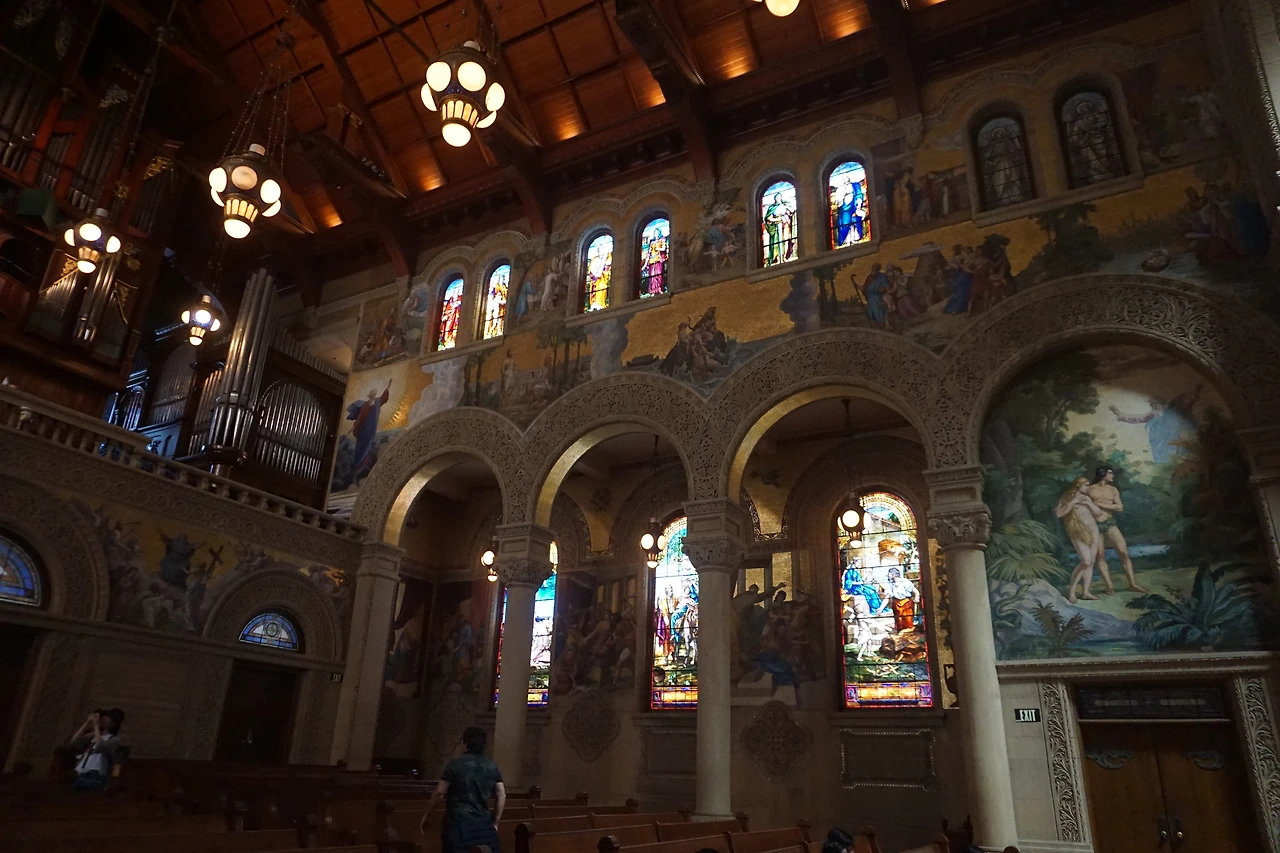가장 인상깊었던 장소는 Stanford Church다. 시간에 따라 천주교 미사, 영국 성공회식 예배, 개신교 예배 등 다양한 기독교 예배를 드릴 수 있다고 한다. 굉장히 큰 규모의 이 Church에 그려진 벽화나 Stained Glasses는 원본이 있는 유럽명화를 그대로 따라 그렸다고 한다. 성화로 교회에 장식하려고 당시 교황님의 허락을 받기위해 Stanford부인은 바티칸을 갔다왔다.