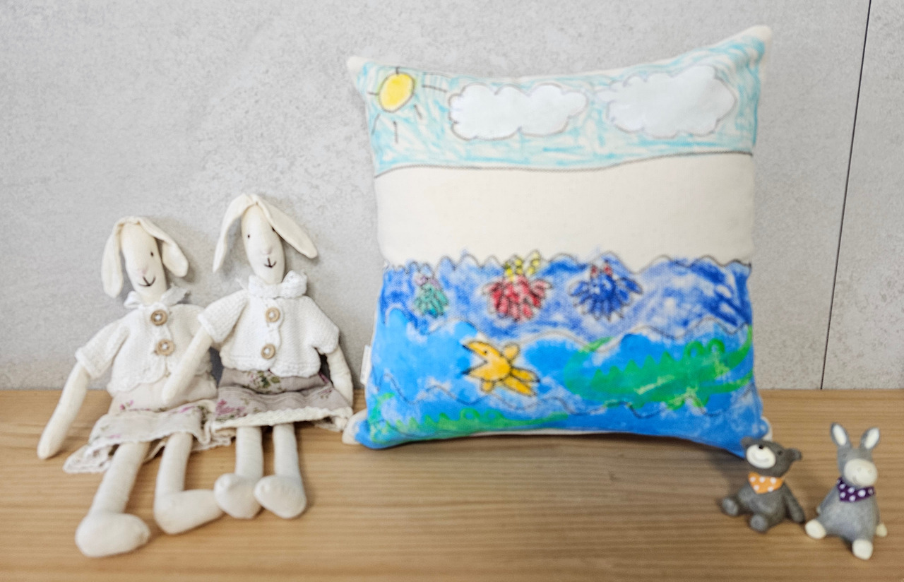 채색을 마친 쿠션을 잘 말린 뒤 몽글몽글 쿠션솜을 아이들이 직접 넣어준다.