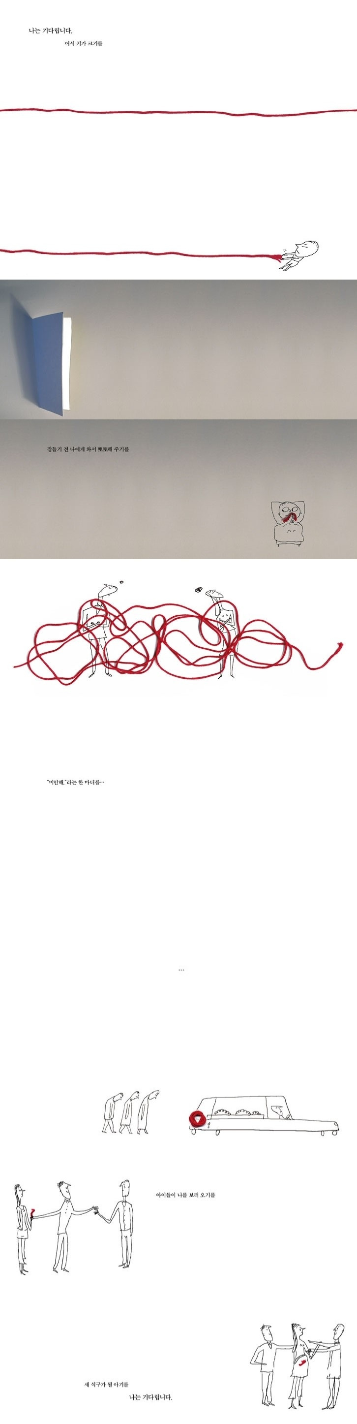 이야기는 코 밑에 붉은색 실타래가 늘어져 있는 아이에서 시작됩니다. 잠자기 전 나에게 와서 뽀뽀해 주기를, 케이크가 다 구워지기를, 비가 그치기를, 크리스마스가 오기를 기다립니다. 이어 성인이 된 아이가 걸어가는 모습으로 장면이 전환됩니다. 주인공의 뒤에는 구불구불한 끈이 뒤따라 옵니다. "나는 기다립니다. 사랑을"이라는 글귀를 보아 주인공의 인생이 다시 커다란 변화를 맞게 될 것을 예측할 수 있습니다. 그는 영화관에서 사랑하는 여성을 만나고, 전쟁으로 인해 헤어지며, 전쟁터에서 부상을 당하면서 그녀의 편지를 기다리지요. 둘은 결국 결혼하게 됩니다. 그리고 태어날 아기를 기다립니다. 아내는 자신과 연결된 빨간 끈을 달고 나오는 아기를 출산합니다. 아버지가 된 주인공은 아이들의 성장 과정을 지켜봅니다. 부부사이가 그렇듯 서로 싸우고 화해하는 동안 아이도 무럭무럭 자라 어른이 됩니다. 그 사이 아픈 아내는 남편보다 먼저 세상을 떠납니다. 남자와 여자 사이의 실은 끊어져 버렸습니다. 아내의 장례식을 치르고 혼자가 된 그는 아이들이 찾아오기를 기다립니다. 마지막 장면은 임신한 아내와 함께 아버지를 방문한 아들의 모습으로 마무리됩니다. 새 식구가 될 손자를 기다리며 이야기는 끝이 나는데요. 빨간 실 아래 "끝"이라는 글자를 "끈"으로 고쳐 쓴 장면이 오래도록 마음에 남았습니다.