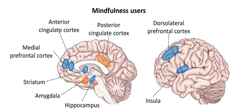 선조체 (Striatum): 마음챙김 수련은 선조체 활동을 통해 긍정적인 경험에 대한 민감도를 높이고, 스트레스 반응보다는 평온하고 긍정적인 상태와 보상을 연결시킬 수 있습니다.