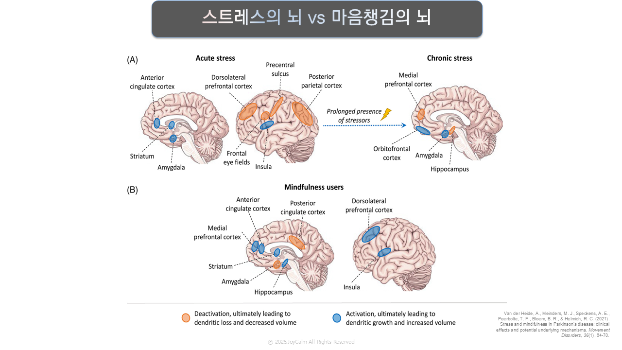 마음챙김(Mindfulness) 수련은 뇌의 특정 영역을 활성화하고 비활성화하여 스트레스 반응을 조절하고 정신 건강을 증진시킵니다.