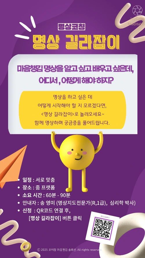 명상과 친해지고 싶은 분들을 위해, <명상, 길라잡이> 명상코칭 세션을 열고 있다.