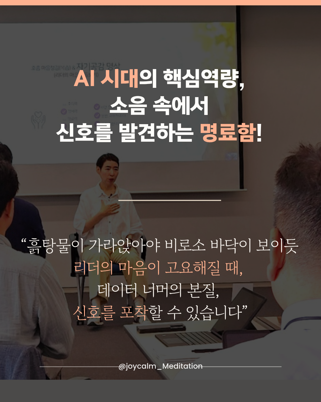 AI가 쏟아내는 무한한 테이터는 인간적 윤리성에 오류가 있을 수 있고, 때로는 그 자체로 또 다른 소음이 될 수 있다. 이제는 자료를 읽고 분석하는 능력이 필요한 것이 아니라, 자료 너머 보이지 않는 것을 보는 '눈'이 필요하다. 소음 속에서 신호를 포착하는 '뛰어넘음' '꿰뚫음'이 필요하다. 그러기 위해서는 내적인 소음을 걷어내는 것이 필수적이다. 내면이 걱정과 불안, 조바심으로 소란스럽다면, 수많은 데이터 홍수에 쓸려가기 십상이다.