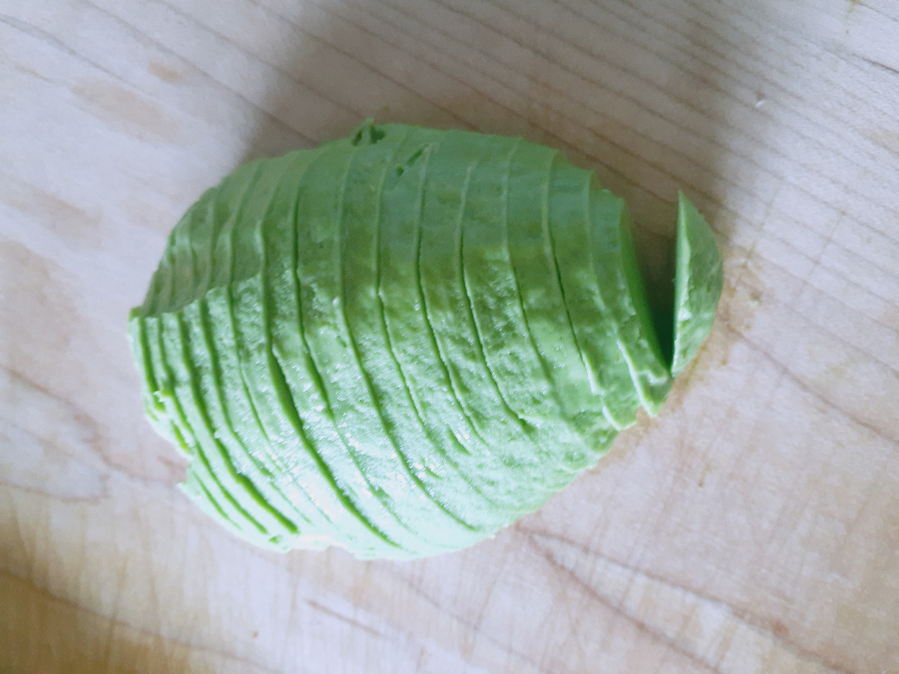 5. 아보카도 반쪽 썰어서 고르게 펼쳐줍니다.