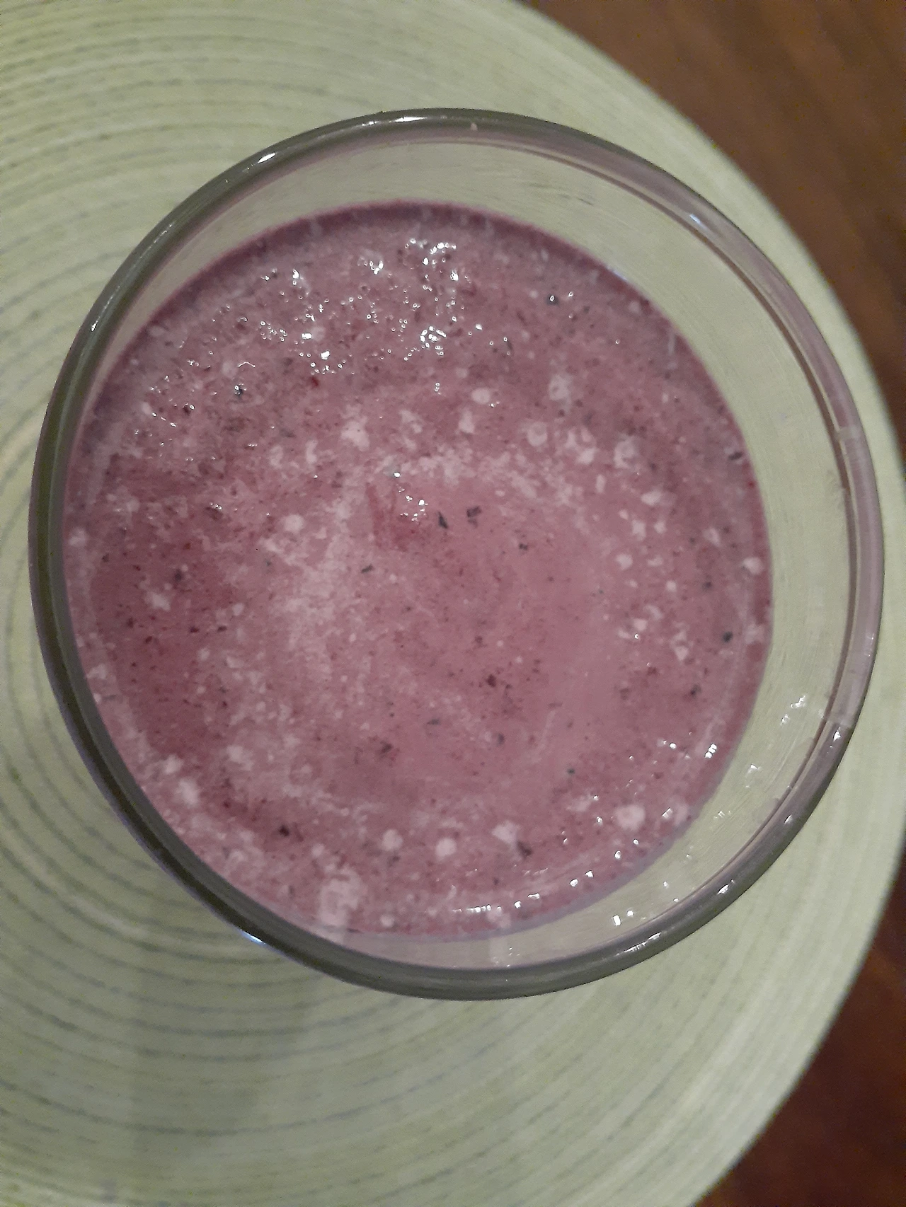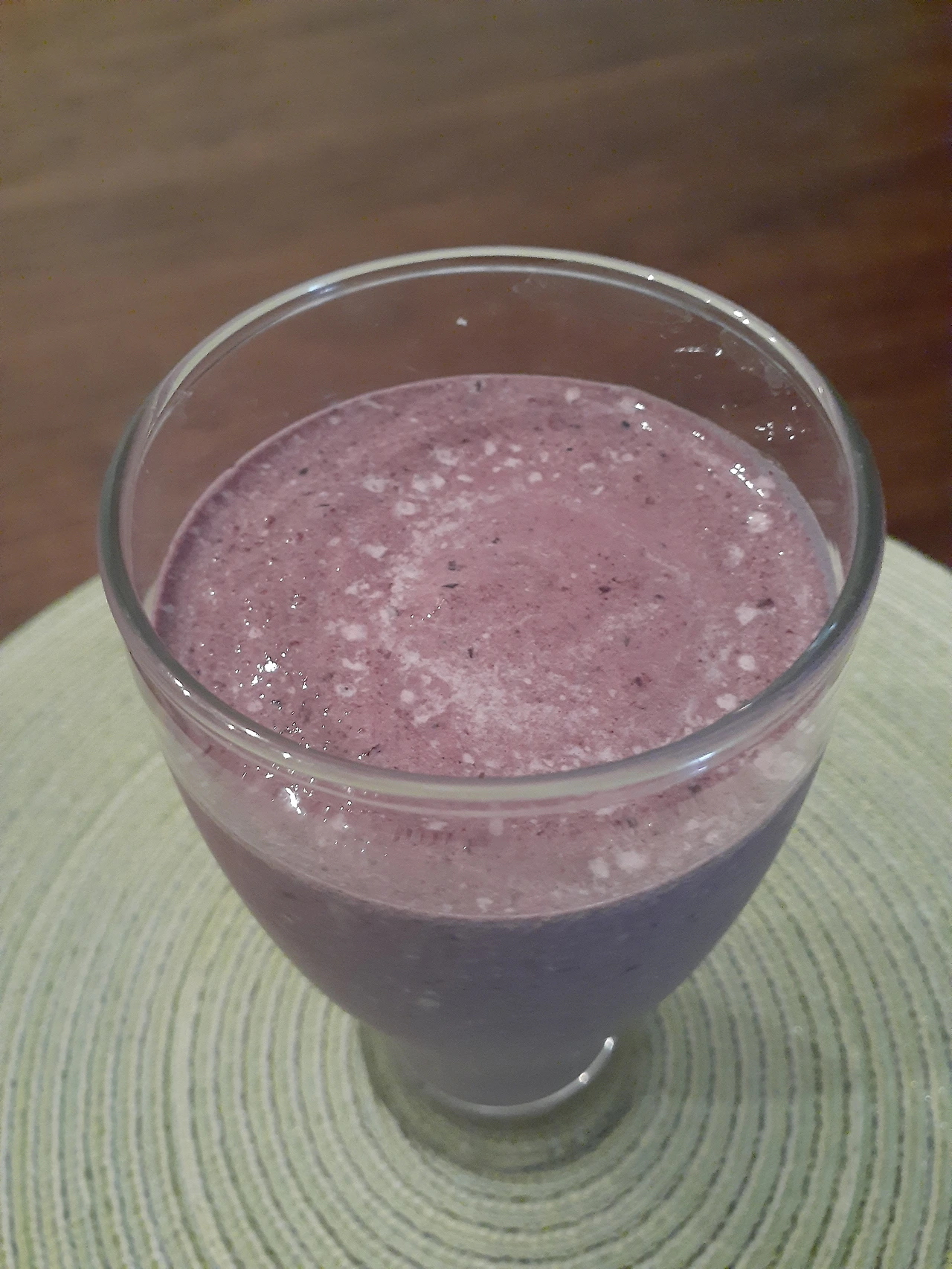 블렌더에 냉동 바나나 1/2정도, 블루베리 반주먹정도 넣어주고, 우유넣고 드르륵 돌려줍니다.