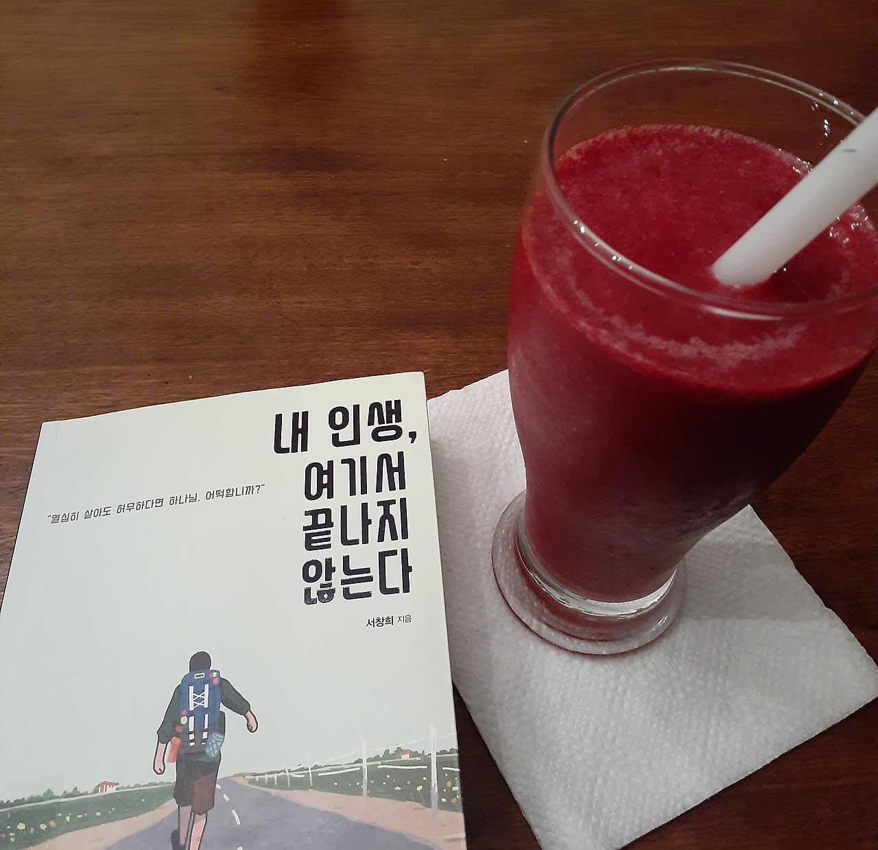 후식으로 냉동과일로 스무디 만들어 한잔하니 오늘 더위는 끝. <내 인생, 여기서 끝나지 않는다>를 읽으며... 끝.