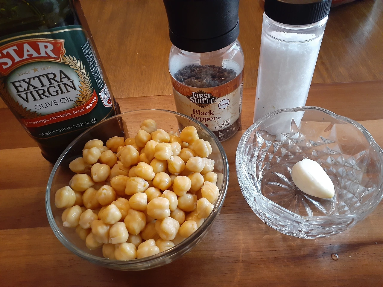 푸드 프로세서나 블렌더에 병아리콩을 넣고 기계가 돌아갈 정도의 올리브오일, 레몬 1개의 레몬즙, 마늘 하나, 후추, 소금 약간씩. 집에 큐민과 강황가루 있으면 약간씩 넣어준다. 없으면 패스.