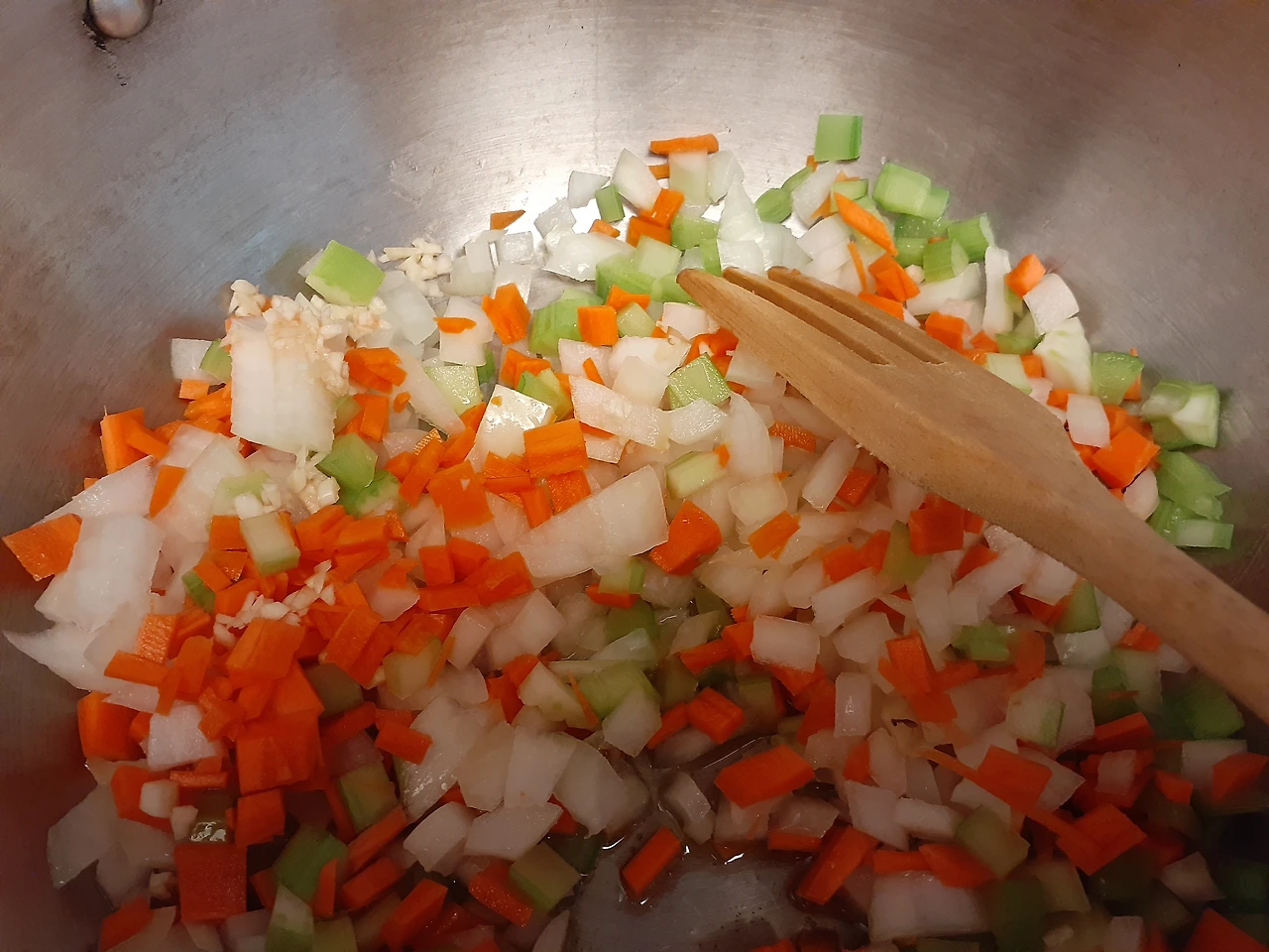 1. 올리브유 2 T/S 넣고 잘게 썰어놓은 양파, 당근, 셀러리와 간 마늘을 넣고 낮은 온도에서 10분 정도 양파가 투명해질 때까지 볶아줍니다.