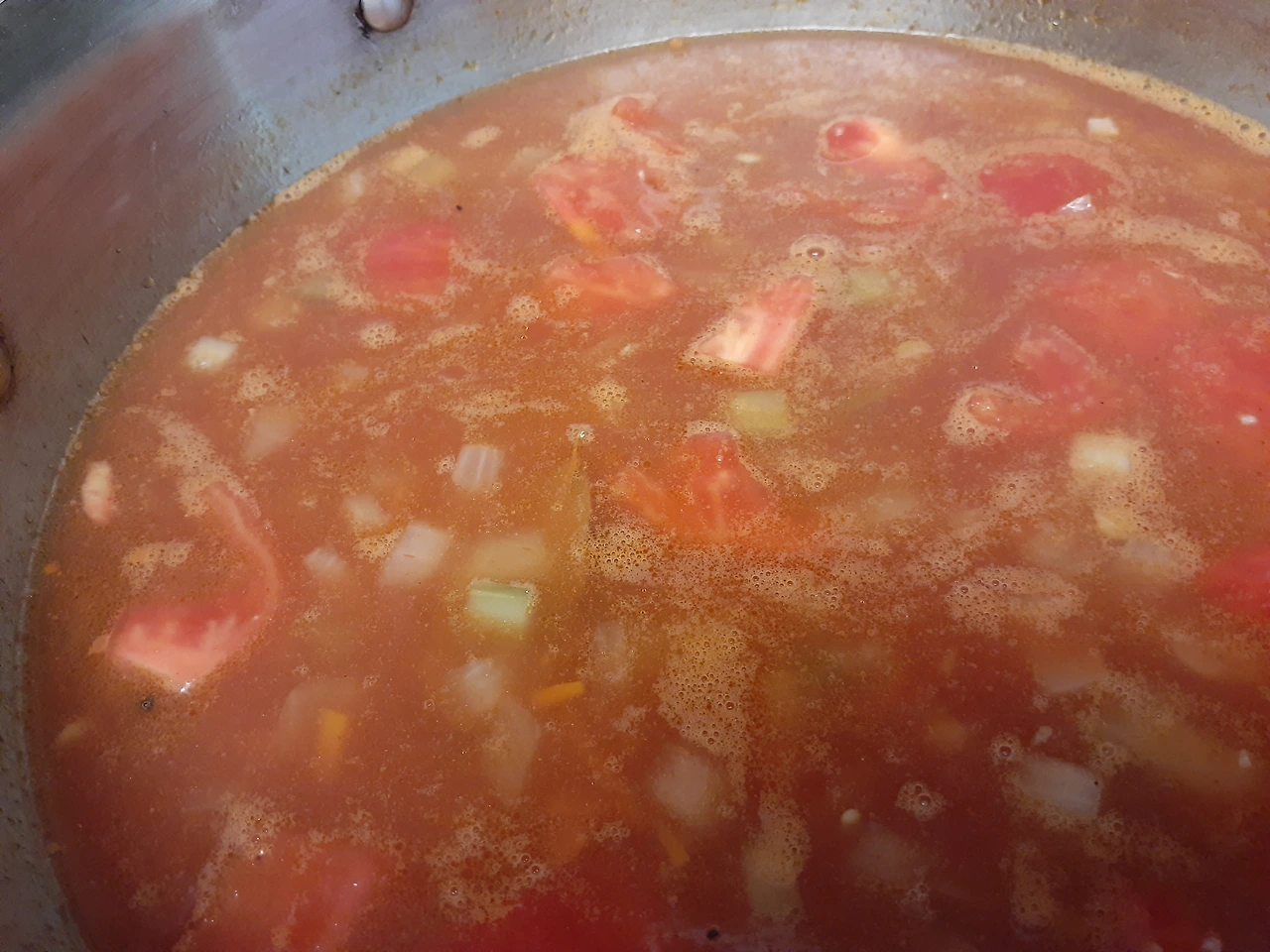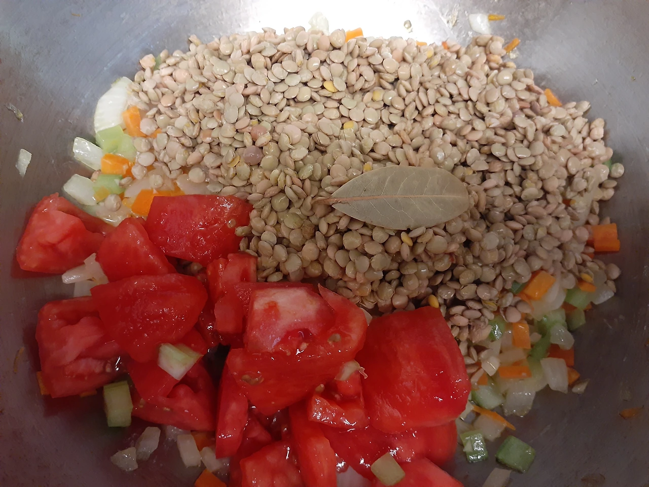 2. 씻어놓은 렌틸과 뜨거운 물에 데쳐서 껍데기를 벗겨놓은 토마토를 적당히 자르거나 으깨어 넣어줍니다.