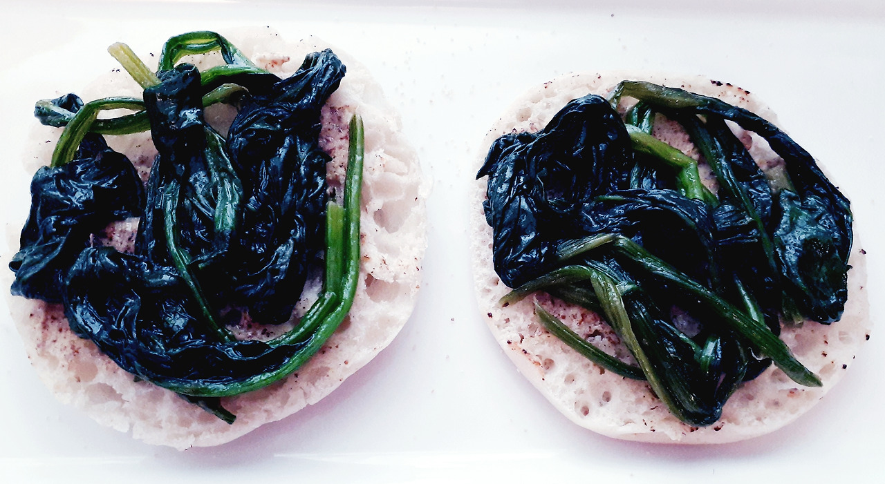 2. 뜨거운 프라이팬에 올리브 오일을 넣고 시금치, 약간의 소금과 후추를 어 볶은 시금치를 빵위에 올려줍니다.