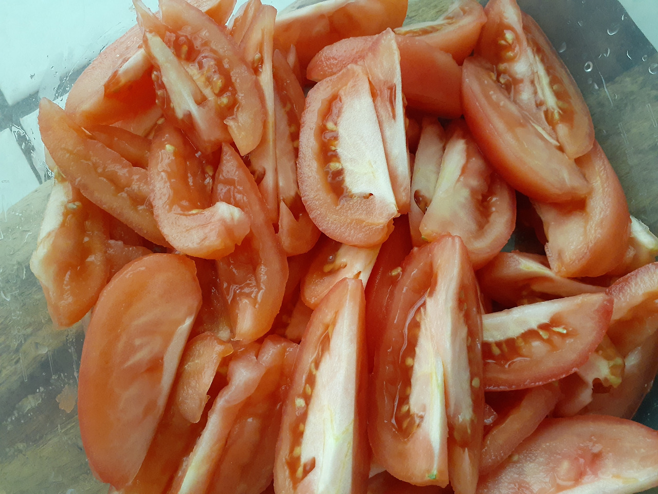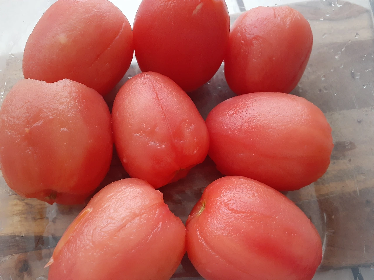 차가운 물에 담가 껍질을 벗긴 후 먹기 편한 사이즈로 썰어줍니다. 저는 로마 토마토 1개를 8쪽이 나도록 잘라주었습니다.