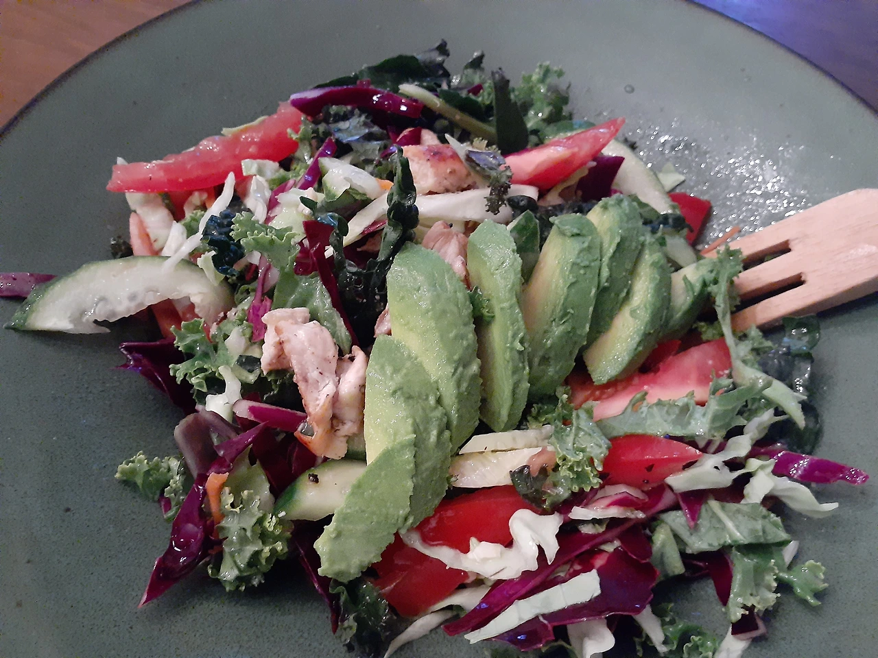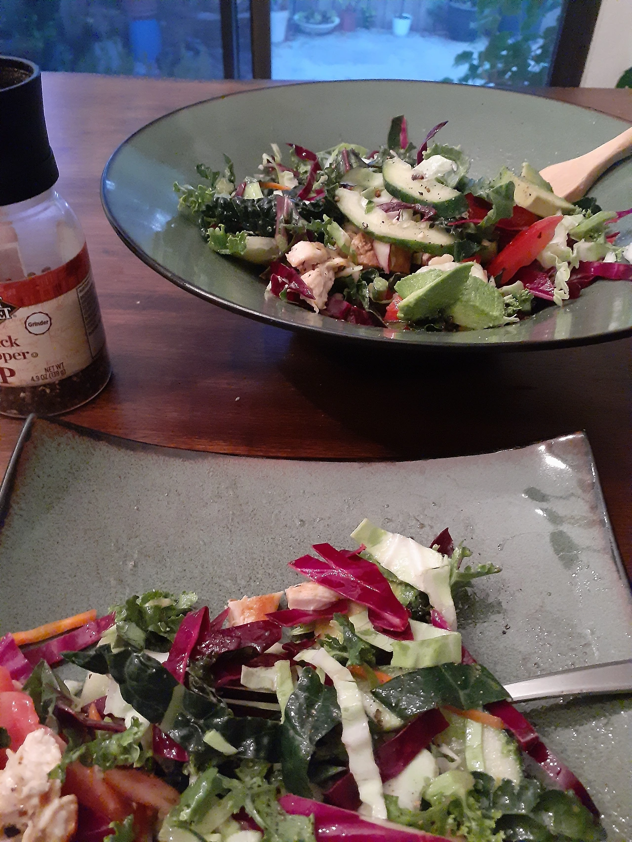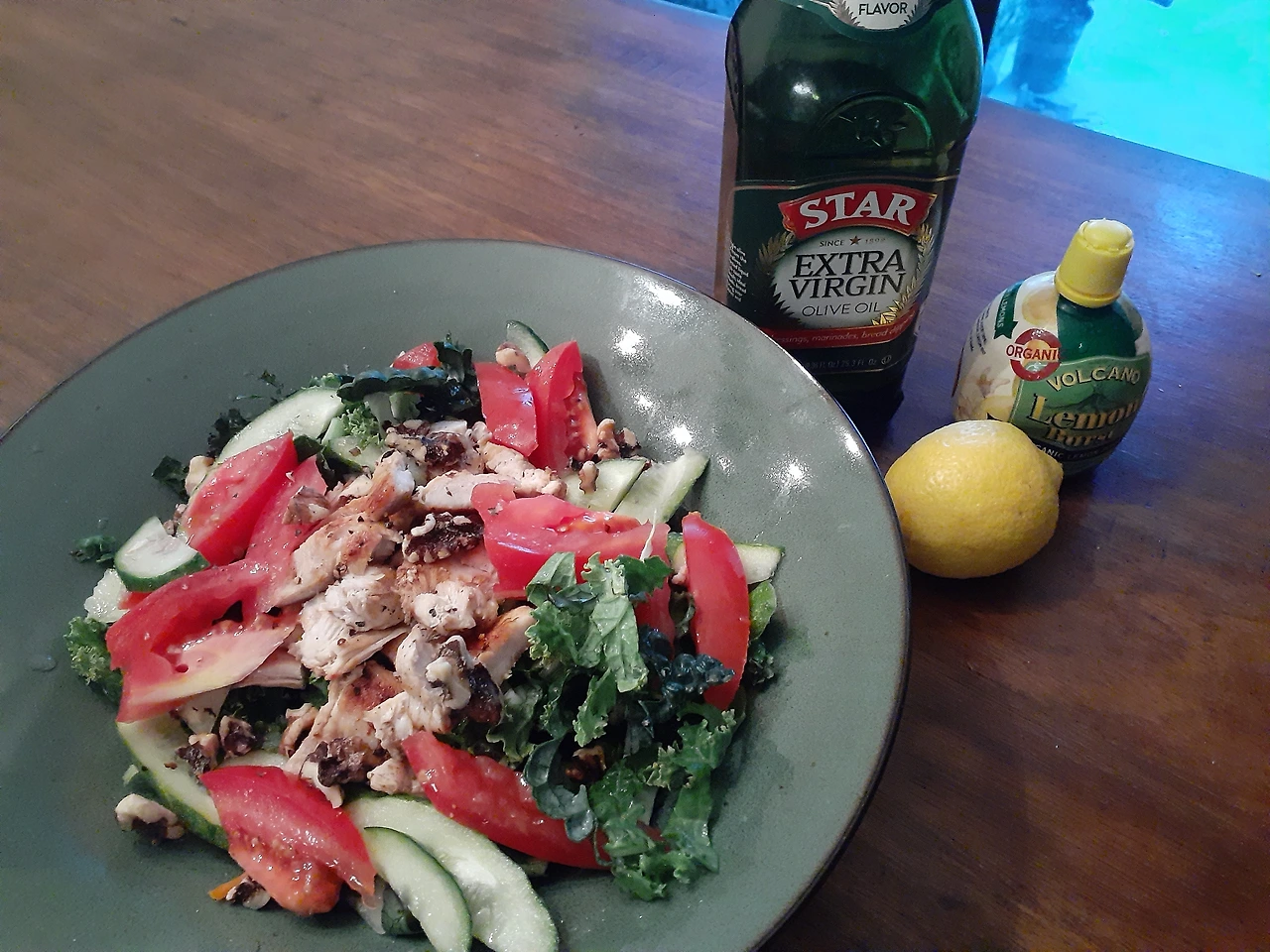 잔열을 식힌 닭가슴살을 먹기 좋게 잘라 넣어주고, 집에있는 견과류, 호도를 부셔서 올려주고, 아보카도 슬라이스 올려주었습니다. 케일의 쌉살한 맛을 중화시키고자 드라이 블루베리 약간 뿌려주었습니다.