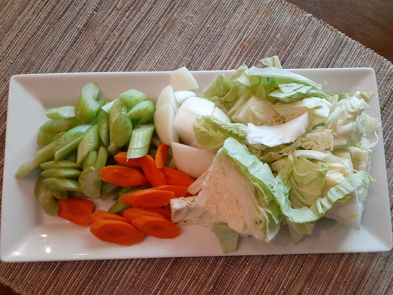 준비해 놓은 샐러리, 당근, 양파와 양배추를 넣어줍니다.