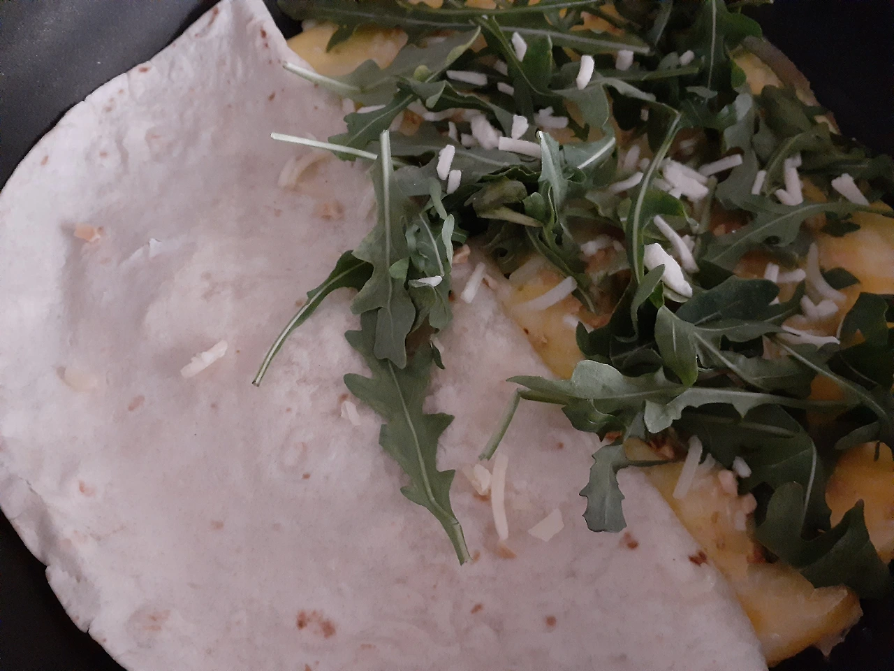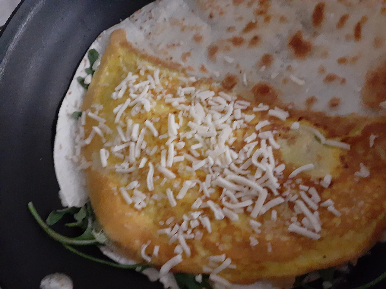 뜨거운 팬에 버터를 바르고 냉동고에서 커낸 또띠야한장 올려줍니다. 타지 않도록 불을 줄이고 부드러워진 또띠야를 반으로 접어놓은 채 같은 팬 한쪽서 계란 2개를 풀어 스크램블 해줍니다. 치즈를 뿌려주고 베이컨이나 햄, 혹은 다른 야채, 좋아하는 것 아무것이라도 넣어보세요. 저는 고소한 맛의 루꼴라를 올려주었습니다.