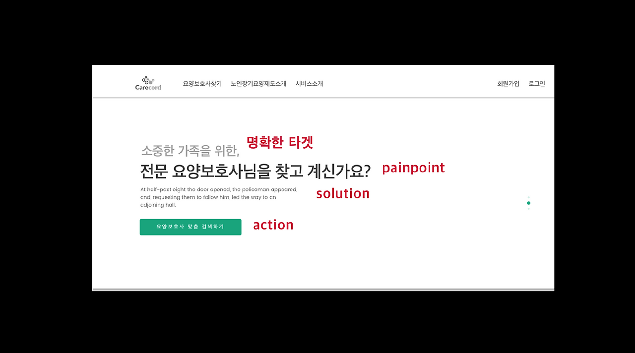 예를 들어 저는 슬라이드 안에 들어가는 문구들도 서비스를 이용하는 사용자에게 어필하기 위해 <타겟을 정하고 - pain point 를 언급하고 - 솔루션을 제시하고 - 행동하는 CTA 버튼을 만드는 것>을 와이어프레임을 만들 때 같이 제시해서 설명했어요. 이처럼 슬라이드 안에 들어가는 내용까지도 기-승-전-결을 만들어 어필하면 더 설득력 있는 디자인이 되겠죠.