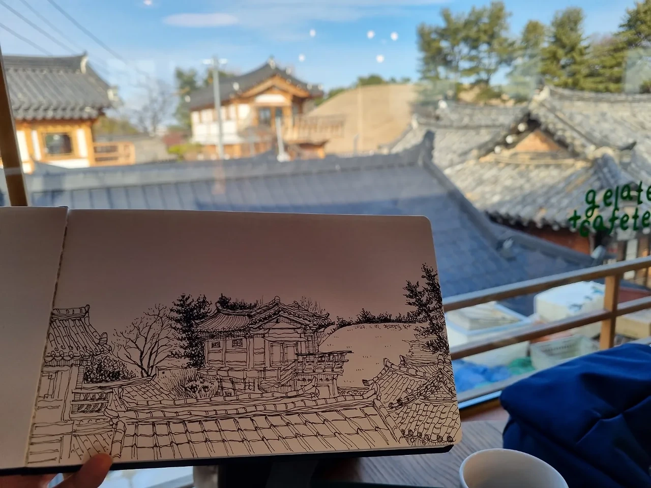 엄마 친구에게 걸려온 전화에 "딸이랑 경주 놀러 왔어." 하는 엄마의 목소리에 힘이 들어간다. "니 아니면 이런데 있는지도 몰랐지. 우리는 경주 오면 보문단지나 가지." 하는 엄마 말에 괜히 우쭐해진다. 한옥 카페 2층에 자리를 잡았다. 한옥으로 둘러싸인 풍경이 마음을 편하게 한다. 창 밖에 보이는 고양이의 움직임에도 엄마는 재미있어하신다.