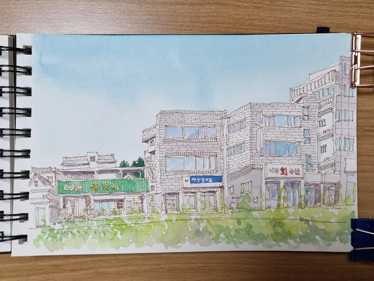 어느 아파트 놀이터 벤치에 자리를 잡았다. 아주 마음에 드는 풍경은 아니지만 앞으로 그림 그릴 날은 많으니 100프로 마음에 들지 않더라도 이 장소를 지키기로 한다. 봄햇살을 받으며 그림을 그린다. 매일 해도 지겹지 않은 행위다. 죽는 날까지 꾸준히 유지하고 싶은 내 취미활동. 지치지 않게 욕심부리지 않고 즐겨야겠다는 생각을 하며 스케치를 하다 보니 배가 고프다. 그러고 보니 점심을 먹지 않았군. 채색은 집에 가서 해야겠다며 정리를 하고 다시 길을 걷는다.