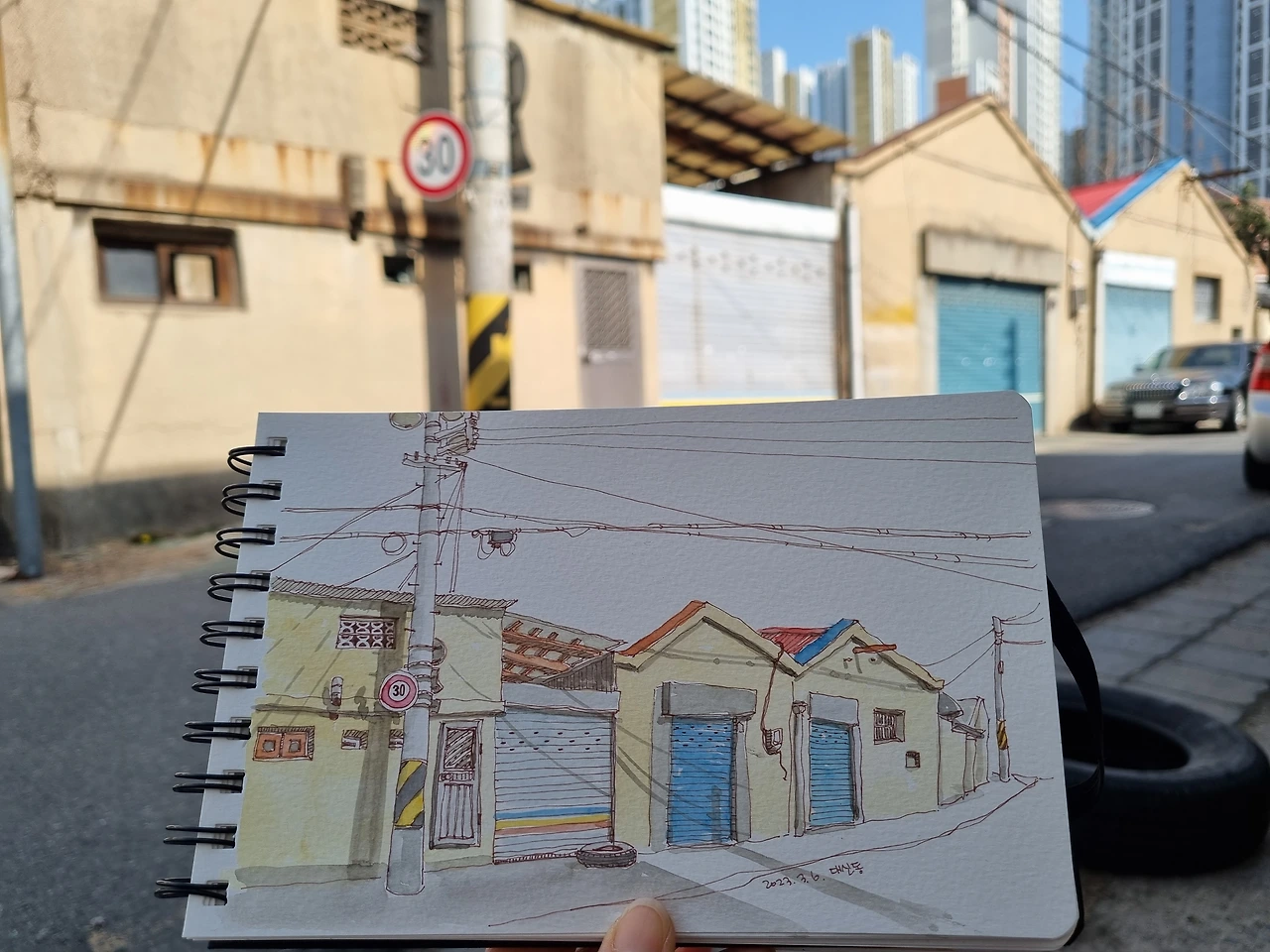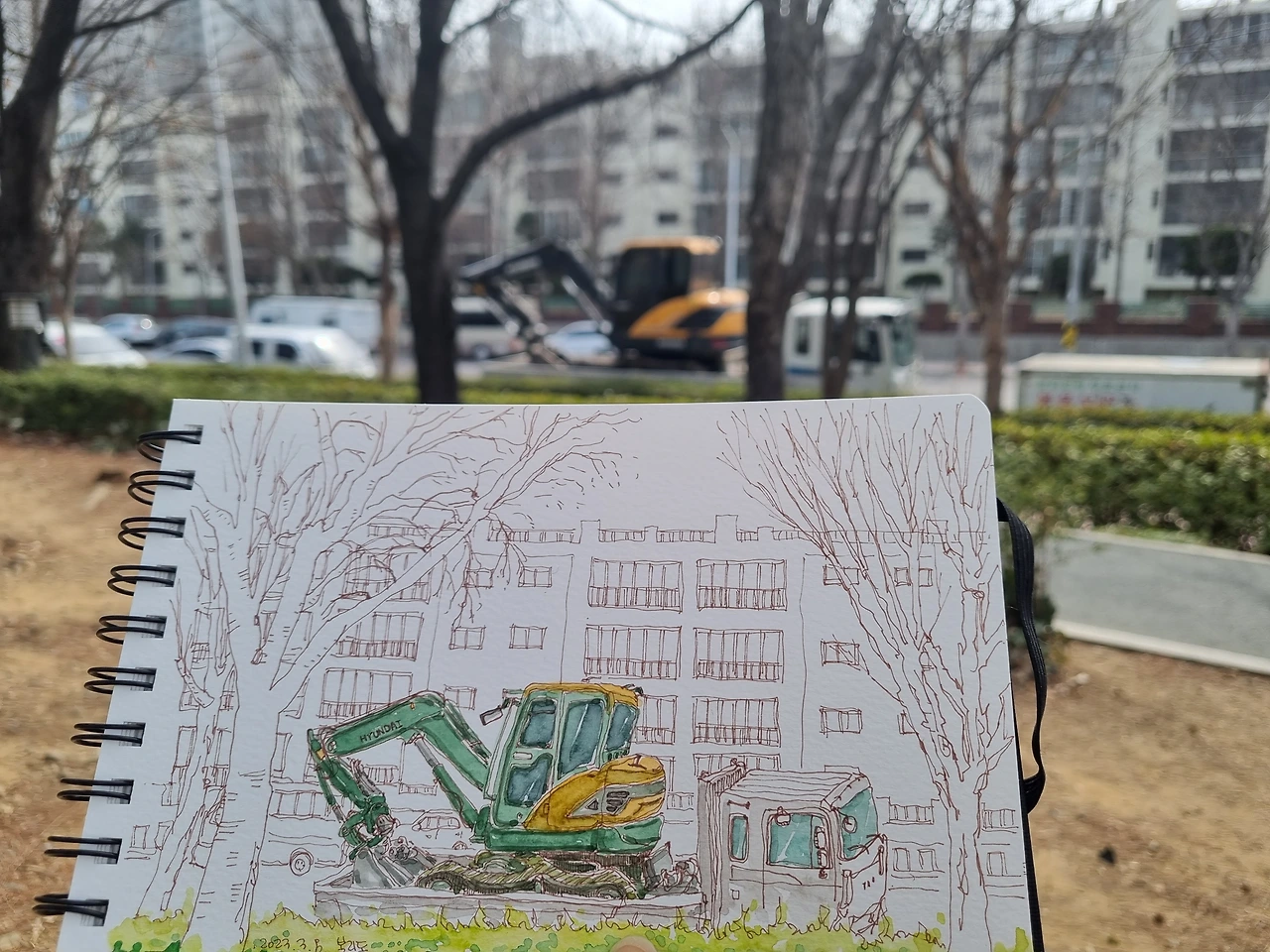 매일 오전에 아무 데나 가서 아무 데나 앉아 그림을 그린다. 남편이 출근하는 길 중간 지점에 떨어뜨려달라고 하기도 하고, 집에서부터 아무렇게나 기분 내키는 대로 마구 걸어가기도 한다. 그렇게 걷다가 그림을 그리고 싶은 장면들을 사진으로 마구 담아보는데, 그렇게 사진에 담긴 모습을 그리기에 적당한 자리가 있으면 그곳이 오늘 머물러 갈 장소가 된다. 그렇게 어느 벤치에 앉기도 하고 상가 계단에 앉기도 하고 사람이 많이 다니지 않는 곳이라면 땅바닥보다 겨우 한 칸 높은 난간에 주저앉기도 한다. 의자까지 들고 다니는 어반스케쳐들도 있지만 하루 한 시간에서 두 시간씩을 걸을 예정이기 때문에 가방도 최대한 가벼워야 한다. 물론 그림 도구도 최소한으로만 갖추어 나간다.