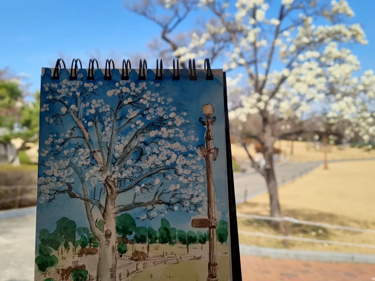 그렇게 앉아 한 시간에서 한 시간 반 정도 그림을 그리다 보면 한적한 길이더라도 지나가는 사람들이 꽤 많다. 저 사람은 뭔가 싶어 한 번쯤 뒤돌아 보며 걷기도 하고, 연세가 지긋하신 분들은 말을 거시기도 한다. 칭찬을 해 주고 가시는 어르신들을 만나면 학교에서 칭찬받아 기분 좋은 학생으로 돌아간 느낌이 들기도 한다. 혹은 그렇게 많은 사람들의 시선 속에서 그림을 그리다 보면 대단한 예술가라도 되는 느낌도 든다. 다만 취미로 그림을 그릴 뿐인데 말이다. 살짝 웃음이 난다. 최소한의 그림 도구를 가지고 내 마음대로 그리면서 대단한 예술가인 척 앉아 있는 내 모습이 우습기도 하다.