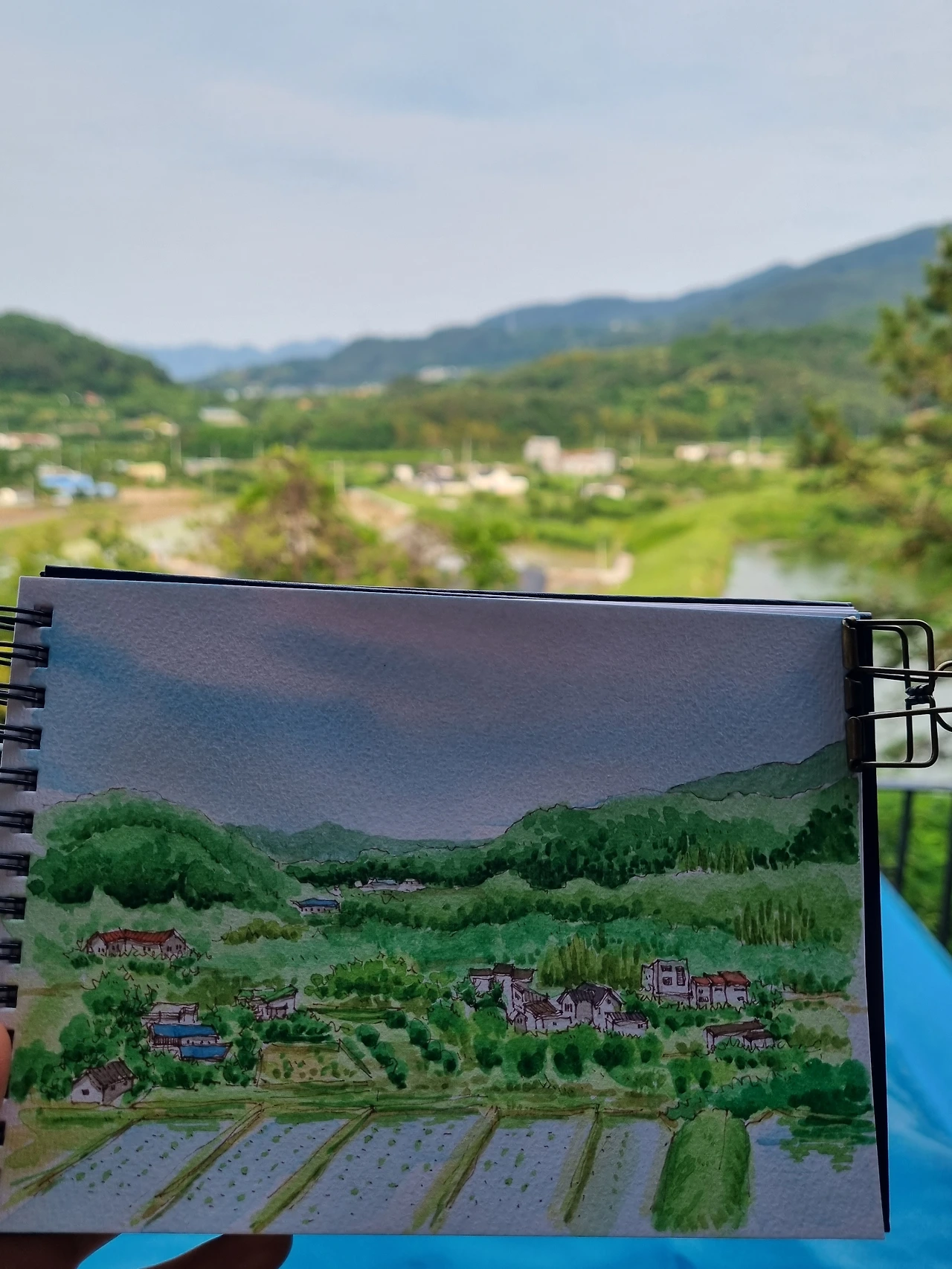 늦게 잠이 든 것 같은데 새벽 일찍 눈이 떠졌다. 아무래도 여행을 오면 잠을 푹 못 자는 것 같다. 나이가 들어간다는 징표다. 읽을 책을 들고 거실로 나왔는데 온갖 새소리와 개구리 소리, 서서히 밝아지며 드러나는 시골 풍경이 멋들어지게 어우러진다. 아~ 좋다. 급히 지도를 켜서 방향을 확인했다. 테이블에 앉아 일출을 볼 수도 있겠다. 새벽에 일어나니 좋구먼.