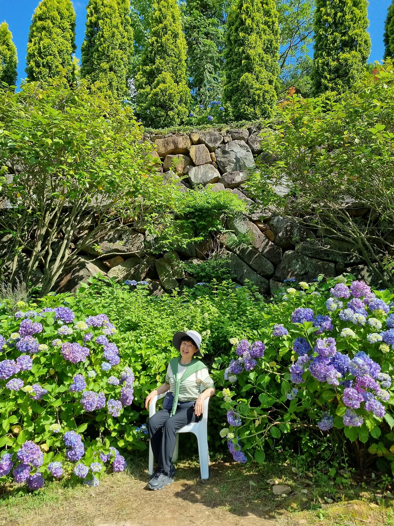 엄마는 사진에 별로 관심이 없으시다. 우리가 어릴 적 사진 찍기가 흔했던 문화도 아니었고. 같이 여행을 다녀도 그 흔한 스마트폰 한 번 꺼내 풍경이라도 한 번 찍으시는 일이 없으시다. 그러다 보니 딸 사진을 찍어주실 생각도 못 하셨고, 예쁜 풍경 앞에 서 보시라고 하면 "같이 찍자" "나는 어릴 때 하도 외롭게 커서 혼자 찍기 싫어"하시며 사진 찍기를 거부하신다. 그러면 예쁜 배경은 다 가려지고 엄마와 내 얼굴만 가득한 셀카만 가득 남곤 했다. 그러시던 엄마가 수국 앞에서 내 사진을 찍어주시고는 "나도 거기서 찍어야겠다. 엄청 이쁘네"하신다!! "나는 어릴 때 하도 외롭게 커서.."로 시작되는 멘트가 하도 지겨워서 "알겠어요. 엄마 찍기 싫으면 안 찍어 돼."하고 신경질을 부리기도 했는데. 그러시던 엄마 입에서 "나도 여기서 찍을란다"라니. 사람은 바뀌지 않는다고 했는데. 나이 70의 엄마가 바뀌셨다. 오로지 내 공인 것처럼 나는 마구 가슴이 뛴다. 감격스럽다.