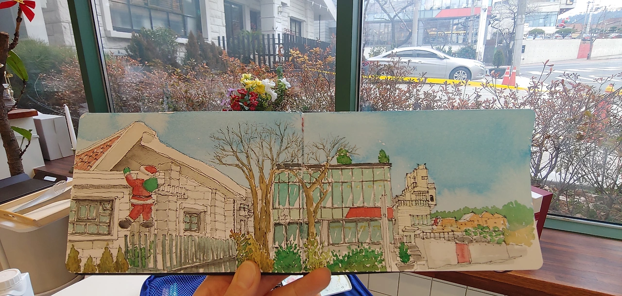 기대에는 못 미치는 식사를 마치고 그림 그리기 좋은 카페를 찾아 나선다. 카페 문 앞에 서서 구도를 잡아보고 고개를 흔들며 다른 장소를 찾는다. 그렇게 찾은 오늘의 카페는 테이블 두 개 놓인 작은 카페다. 커피를 주문하고 테이블에 짐을 펼치니 "드시고 가세요?"하고 묻는다. 이곳은 디저트가 유명한 곳이라 대부분 손님들이 쿠키와 커피를 바로 사서 나간다. 주인이 바로 보이는 곳에 앉아 그림을 그리기 민망하기도 하지만 나는 씩씩한 어반스케쳐다.