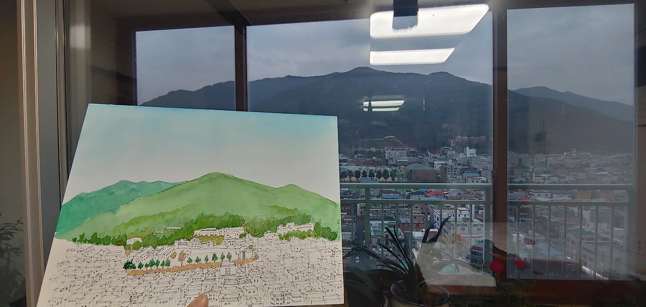 제주 호텔에서 한라산 뷰를 그리고 있으니 남편이 "장모님 댁이랑 뷰 비슷하네." 했었다. 그러고 보니 한라산 아래 올망졸망 모인 건물들이 대구 앞산 아래 옹기종기 자리 잡은 주택들과 스케일만 다를 뿐 똑같이 닮아 있었다. 대구 가면 친정집에서도 그림 한 장 그려야지 하는 생각을 했다. 그림 도구는 오늘도 역시 내 가방에 있고. 스케치북을 꺼내 들었다. 앞산이라 불리는 우리 집 뒷산을 먼저 그려 넣고 아래에 보이는 집들을 성실하게 차근차근 그려 넣었다. 우리 엄마 아빠가 너무 좋아하시는 앞산 뷰다. 내가 대학 졸업하고 이사 왔으니 여기 사신 지도 20년이 되셨다. 중간에 이사를 갈까 고민도 하셨지만 이 뷰를 포기하지 못해 이사를 포기하셨을 만큼 엄마 아빠는 이 뷰를 사랑하신다. 계절 따라 변화하는 산의 모습도, 밤이 되면 켜지는 가로등 아래 야경도 모두 우리가 사랑하는 모습들이다.