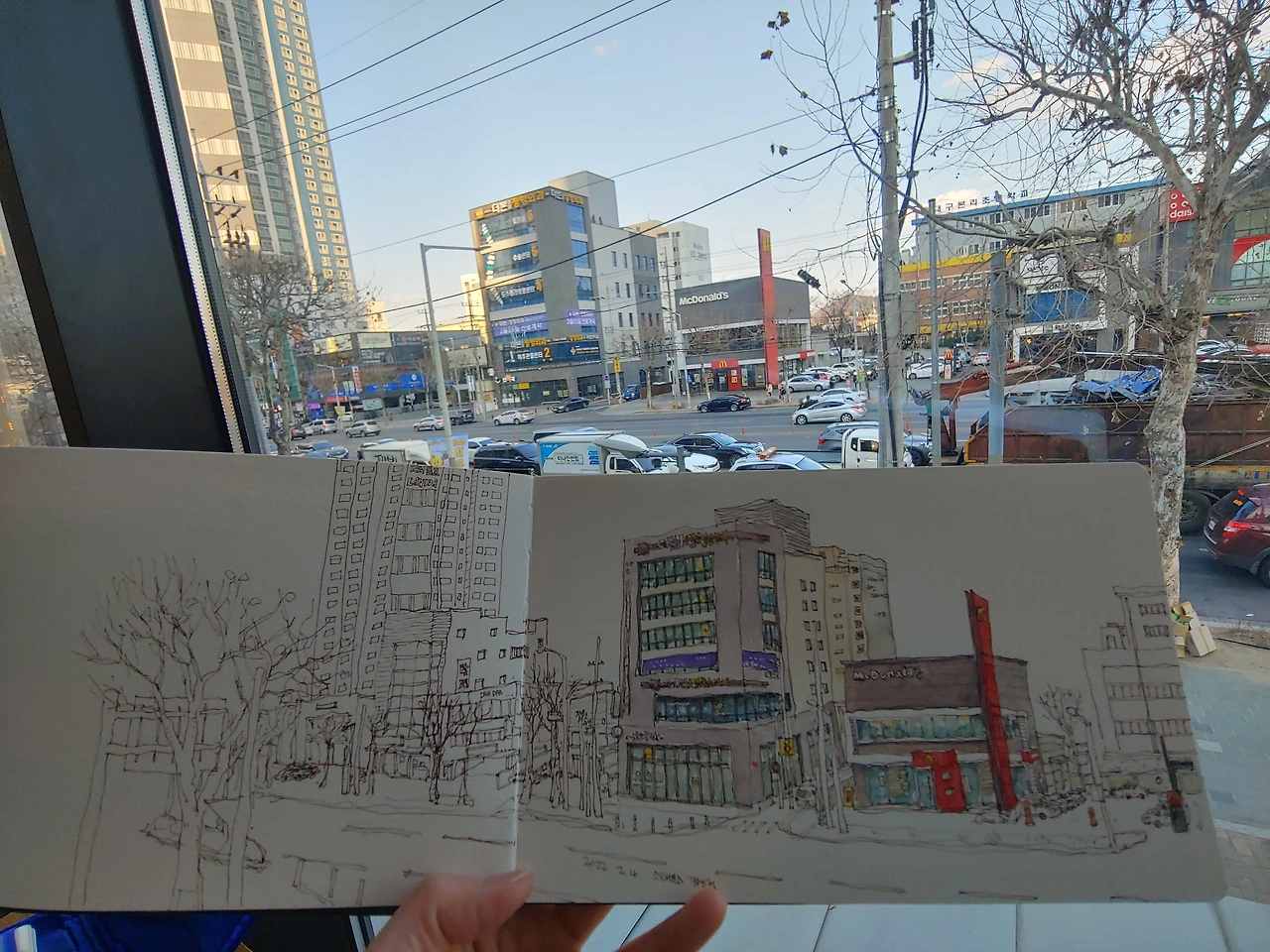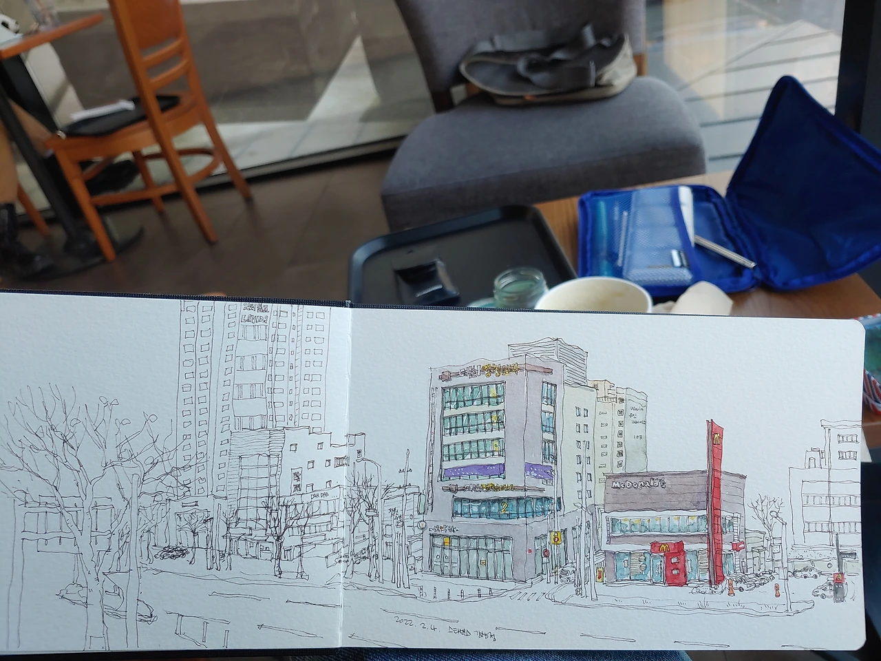 집에서 점심을 먹고 딸내미랑 다시 집을 나섰다. 이미 1시간은 걸었으니 짧은 거리에 있는 카페에서 딸과 맛난 디저트 먹으며 오늘도 그림이나 그릴 생각이다. 평소에 복잡하던 스타벅스가 오늘은 한산하다. 내가 그림 그리고 싶은 자리도 비어 있다. 이미 나는 신난다. 빨간색 간판이 돋보이는 맥도널드가 오늘 그림의 주인공이다. 한동안 그림이 늘지 않아 답답하기도 했는데 요즘은 맘에 드는 그림이 자주 나온다. 오늘 그림도 맘에 든다. 신난다. 신난다.