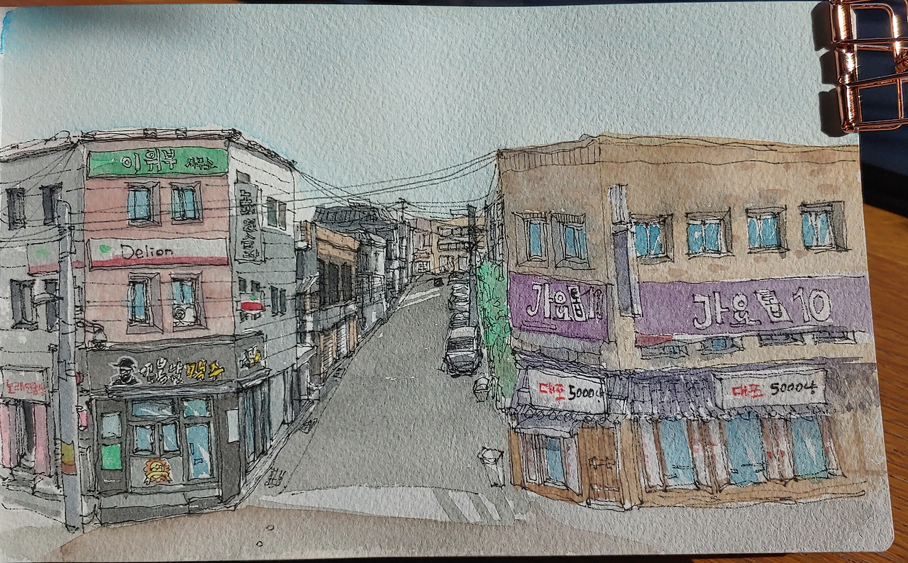 그림을 그리지 않았다면 한 번도 쳐다보지 않았을 간판들을 구경한다. 여기 이런 게 있었구나. 시간이 넉넉지 않아 채색을 할지 말지 망설이다 그림자만 넣어야지 하며 물감을 칠한다. 그렇게 시작된 채색이 생각보다 시간이 많이 걸렸다. 결국엔 바쁜 걸음으로 집으로 돌아가야 한다. 약속시간을 정해 놓고도 미리 나서는 법이 없다. 시간 맞추려 급하게 걷고 뛰는 건 80이 되어도 여전할 것 같다. 습관은 쉽게 변하지 않는다.