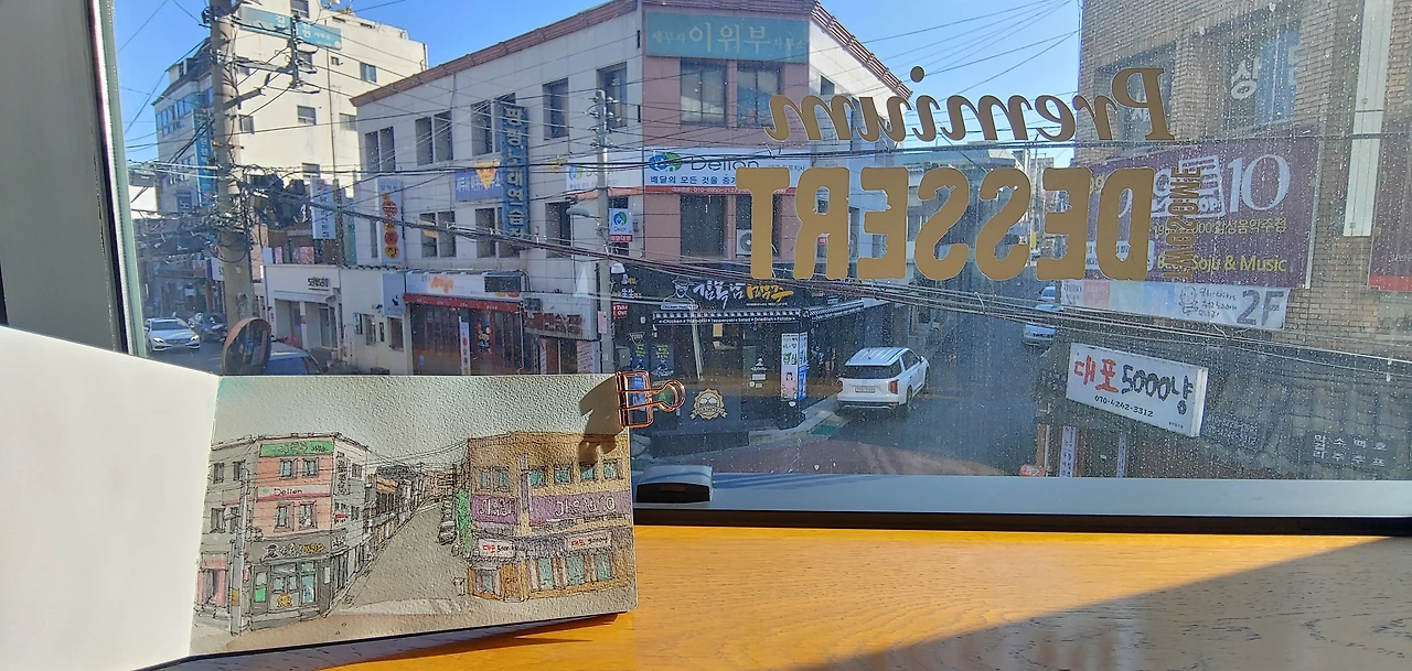 산책을 하며 여기저기 그림 그리기 좋을 곳을 눈에 담아 두었기 때문에 어디로 갈지 망설이거나 고민할 필요도 없다. 30분 거리의 투썸 플레이스. 그곳이면 2시간 안에 그림 그리고 돌아오기 적당하다. 차가운 아침 공기 속에서 씩씩하게 걸어 목적지를 향한다. 이른 아침 카페에는 아무도 없다. 제일 마음에 드는 자리를 골라 앉을 수 있다.