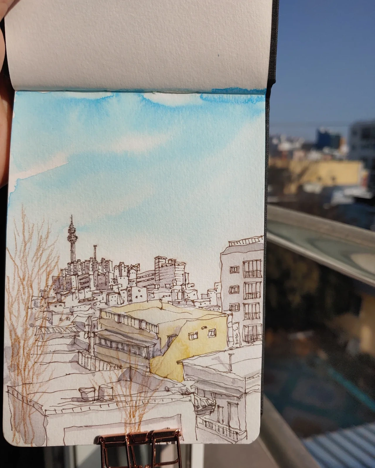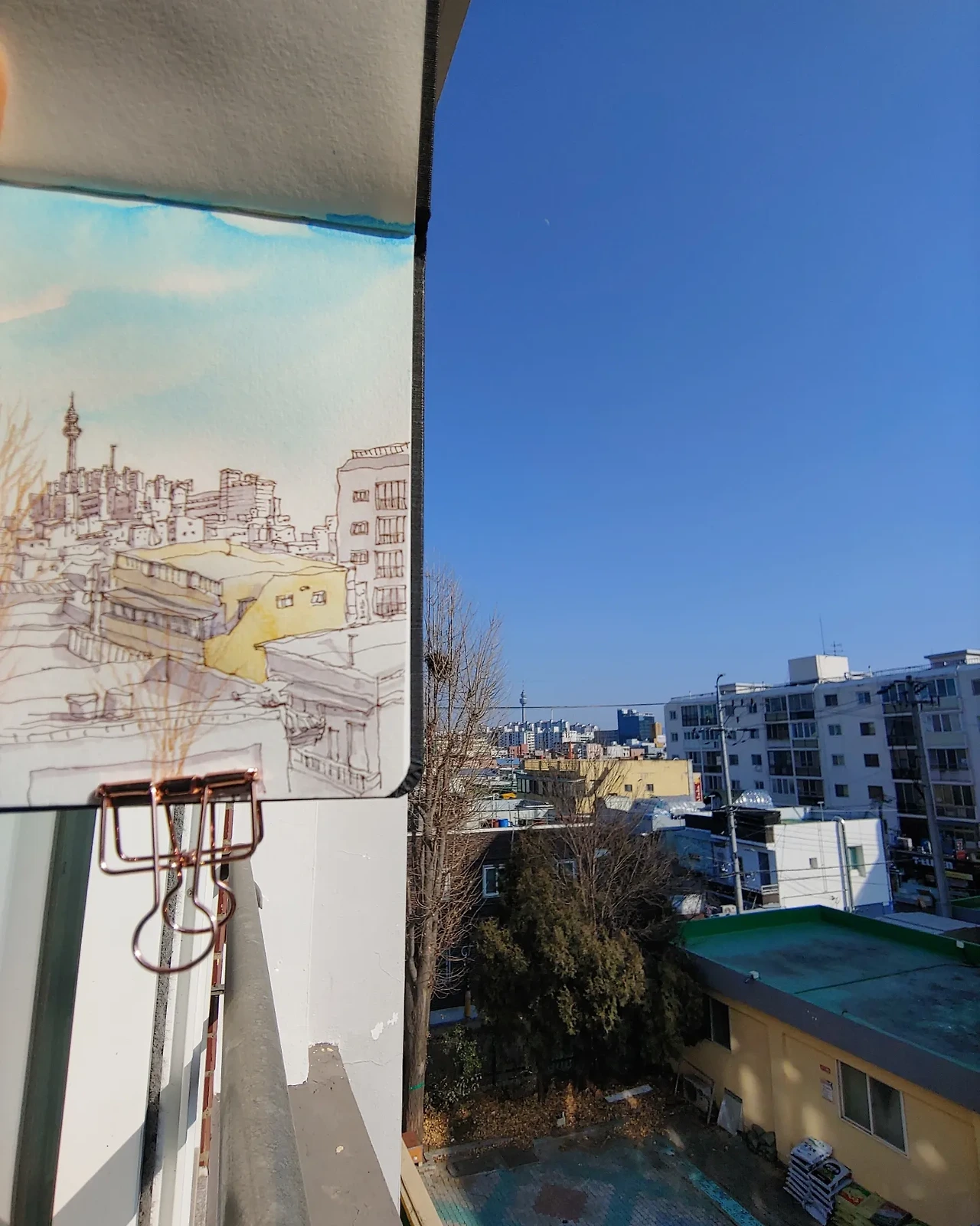 아이들이 하교한 후 바쁜 일들을 마무리해 두고 스케치북을 들고 교실로 올라갔다. 예전에도 여기 앉아서 그렸었지만 그 사이 실력이 조금 늘었으니 내가 좋아하는 뷰를 더 예쁘게 남겨두고 싶었다. 사실 창밖으로 목을 빼지 않으면 잘 보이지 않는 뷰라 편하게 앉아서 그리기는 힘들다. 창가에 서서 몇 번이나 창밖으로 목을 늘이며 그림을 완성했다.