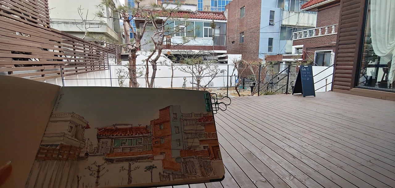 이른 아침에 나섰더니 아직 문을 연 카페가 잘 없다. 한참 걸어갔다 돌아오는 길에 카페는 들러야겠다고 카페를 몇 군데 눈에 담아두었다. 그러다 길거리에 세워서 입간판 하나를 보고 좁은 골목으로 들어섰다. 주택을 개조한 예쁜 카페 하나가 나타났다. 네이버 지도에도 표시되지 않은 걸 보니 생긴 지 얼마 안 됐나 보다.오픈 기념으로 아메리카노가 2000원이라니. 이 시간에 문이 열려 있는 것만도 감사한데, 겨우 2000원에 음료와 이 좋은 공간을 사용하게 되었네. 그림을 그리고 있으니 스콘 구우셨다며 맛보라고 한 접시를 내어 주신다. 따뜻한 말투와 친절함에 한없이 기분이 좋아진다.단골 하고 싶어지는 카페다. 늘 다른 곳에서 그림을 그리느라 단골이라고 할 만한 곳이 없지만 집 근처에 아지트를 하나 마련한다면 여기로 정하겠어.