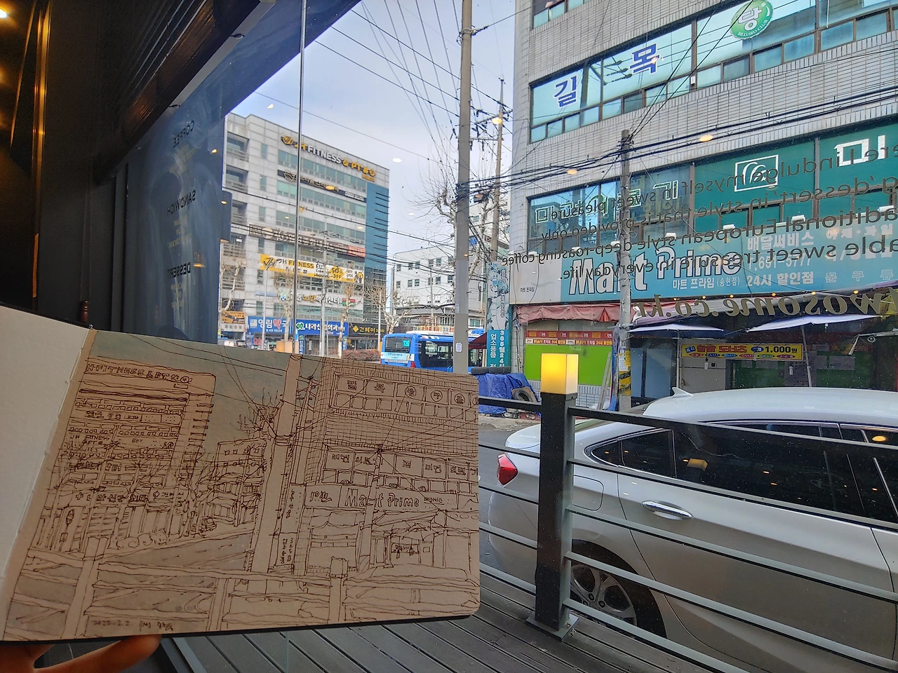 설 연휴 첫째 날 오후와 둘째 날을 어머님 댁에서 보내고, 사흘째 친정을 가는 날이다. 그동안 못 걸었으니 친정까지는 걸어가겠다며 약속 시간을 1시간 반 남겨두고 나 홀로 먼저 집을 나섰다. 30분은 친정까지 걷는 시간, 1시간은 그림 그리는 시간이다. 친정까지 걸어가는 내내 새로운 길을 찾으며 그림 그릴 장소를 찾아 두리번거린다. 하지만 설 연휴 이른 시간에 문을 연 카페는 대형 프랜차이즈 카페들 뿐이다. 친정 옆에 있는 투썸에 자리를 잡았다. 친정에 올 때마다 커피나 케잌을 사러 잘 들르는 곳이다. 어느 해에는 다른 식구들은 집에 남겨둔 채 엄마와 여동생, 나 셋이서 빠져나와 수다를 떨었다. 그때 앉았던 자리가 눈에 들어온다.