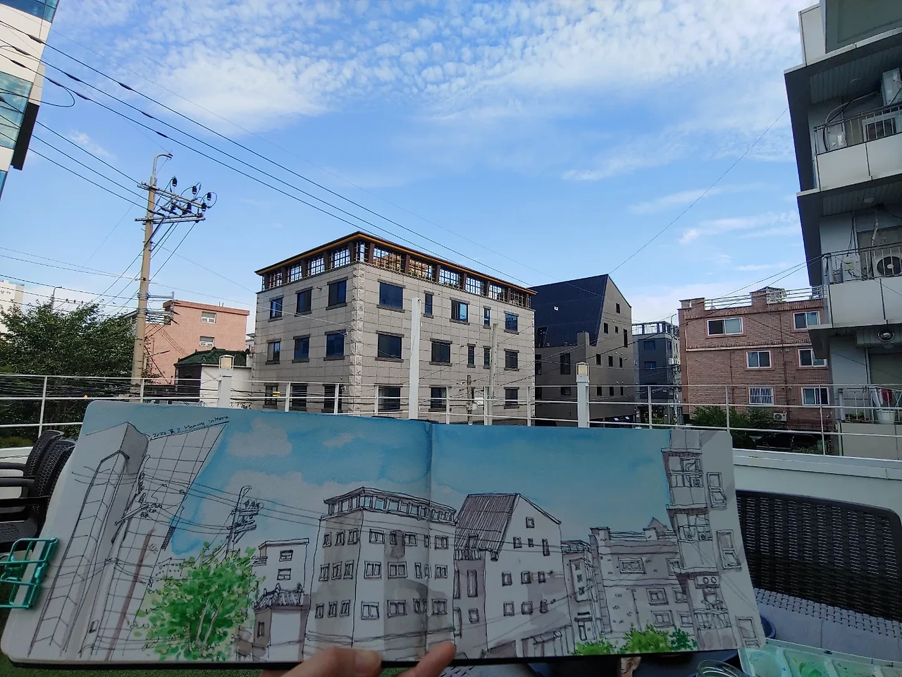 그런데도 굳이 나는 야외 테라스 석을 고르고 말았다. 가장 그리고 싶은 장면을 테라스에서 찾고 말았다. 결국 따뜻한 아메리카노를 들고 이 더운 여름날 야외에서 그림을 그린다. 차에 있는 아이스 아메리카노라도 들고 와야 하는지 고민한다. 이런 어처구니없는 짓이라니.