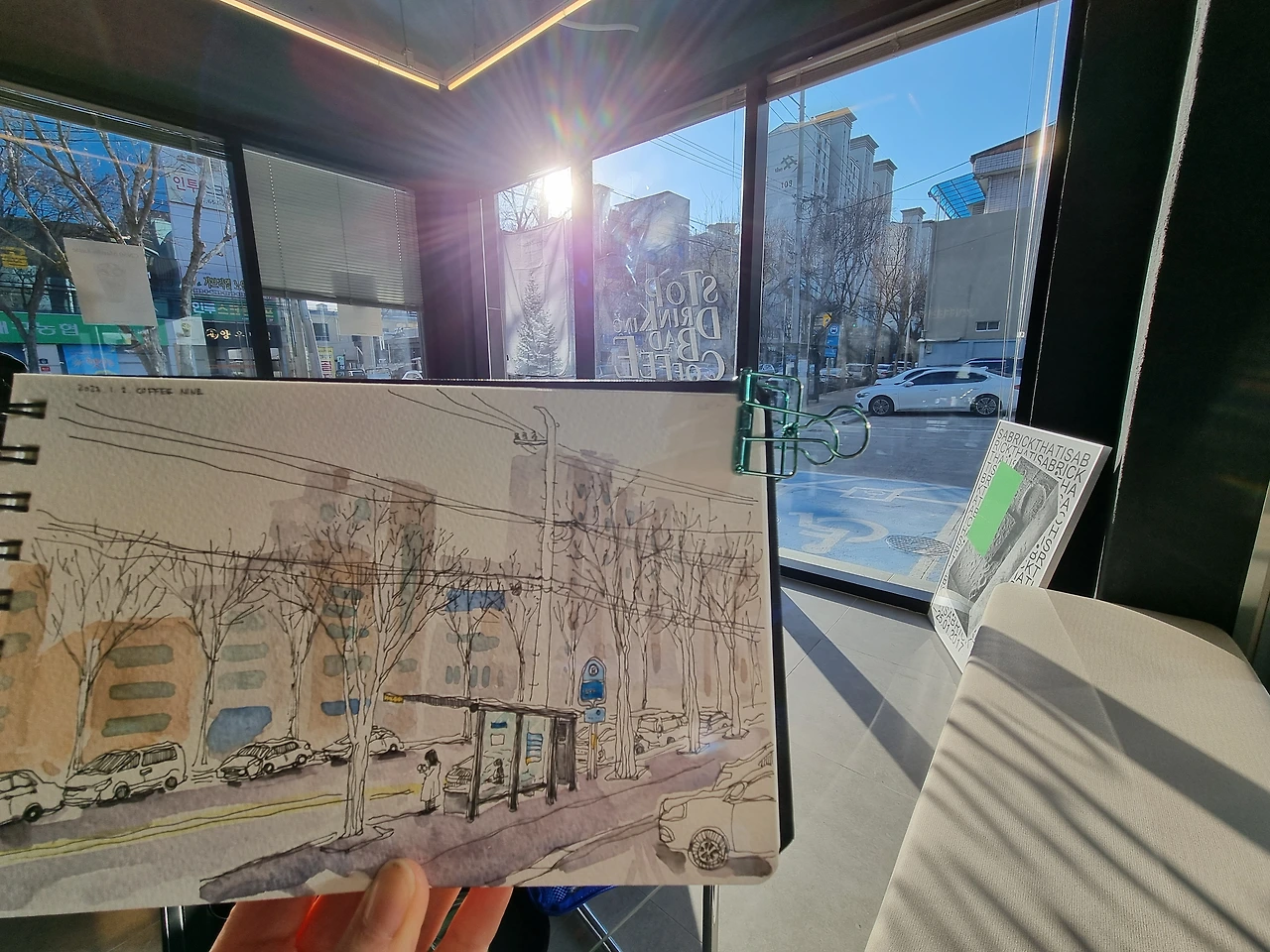 이래도 집에 안 들어간다고? 올해는 휴직했으니 매일 어반스케치를 하고픈 욕심이 있었는데 겨우 이틀 만에 펑크를 내고 싶진 않다. 집에서 다시 멀어지기 시작한다. 다시 첫 번째 카페를 지나고 두 번째 카페를 지난다. 그러다 마음에 덜 들었던 카페로 다시 돌아간다. 더 이상 이 추위에 돌아다니는 건 아니다. 마음에 덜 드는 풍경이라도 그려야겠다. 그래도 창이 넓고 창가 자리도 많이 비어있다.